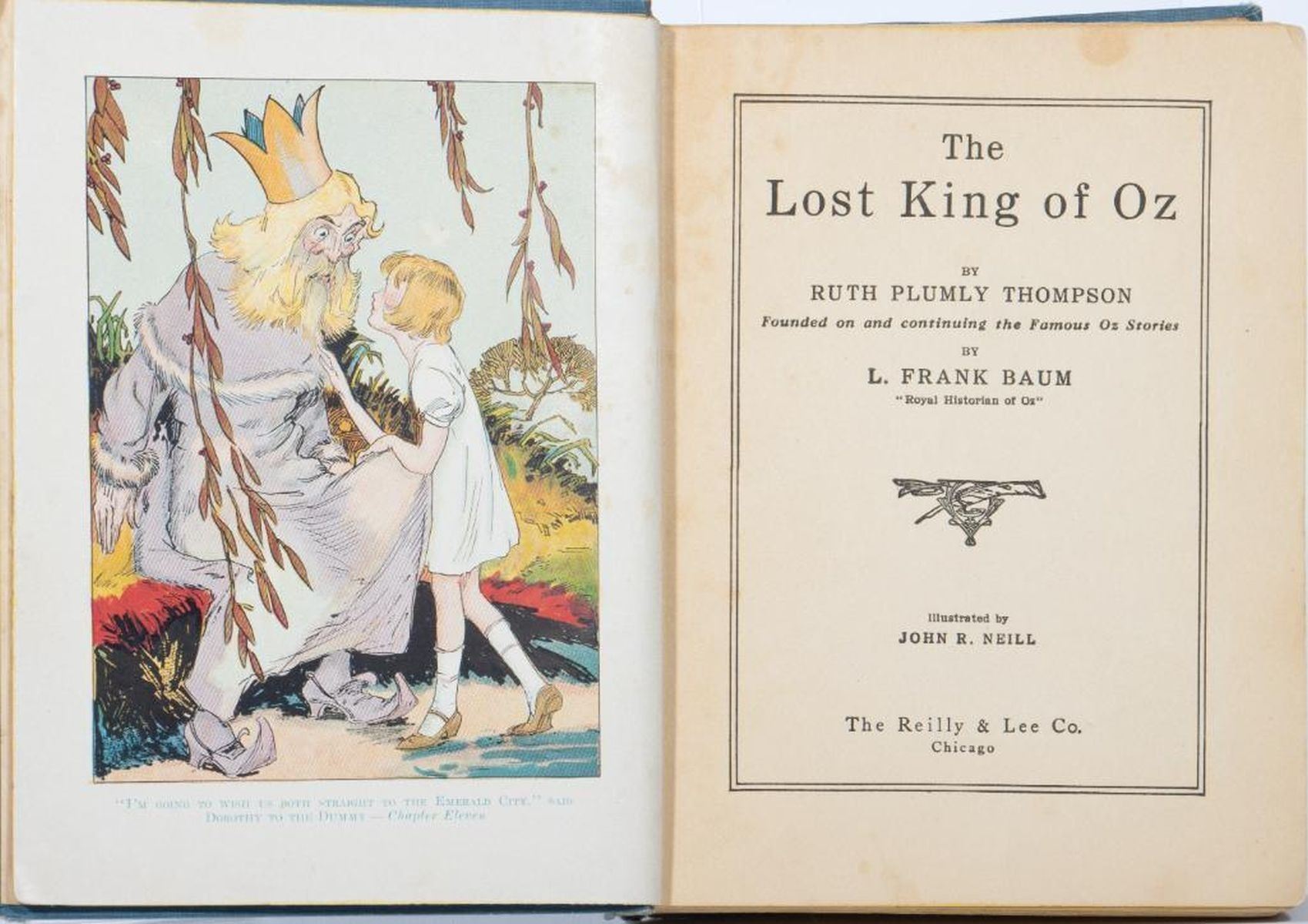 The Lost King of Oz by Ruth Plumly Thompson, illustrated by John R. Neill. Reilly & Lee 1925 1st edition. Illustrated with 12 color plates and numerous black & white drawings by John R. Neill. Original dark blue cloth, pictorial cover label; black & white pictorial endpapers. Very good. Rubbed front cover, browned endpapers, previous owners name penciled on ownership page.