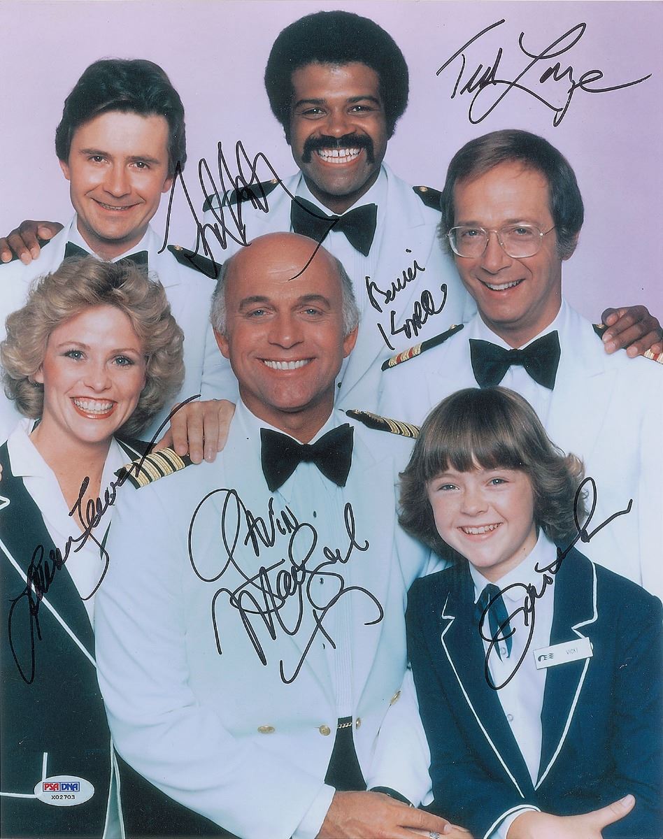 Color satin-finish 11 x 14 photo of the crew of the Pacific Princess, signed in black felt tip by Gavin MacLeod, Bernie Kopell, Ted Lange, Fred Grandy, Jill Whelan, and Lauren Tewes. In fine condition. Accompanied by a full letter of authenticity from PSA/DNA.