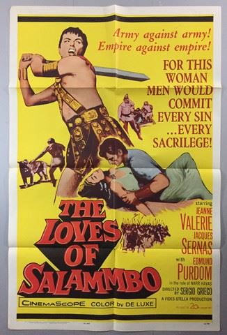 The Loves of Salammbo (Twentieth Century-Fox Studios, 1960). One Sheet. Number 62/406. Starring: Jeanne Valérie and Jacques Sernas. There are fold lines, creases, markings, stamps and minor edge wear. Very fine. (27" X 41").
