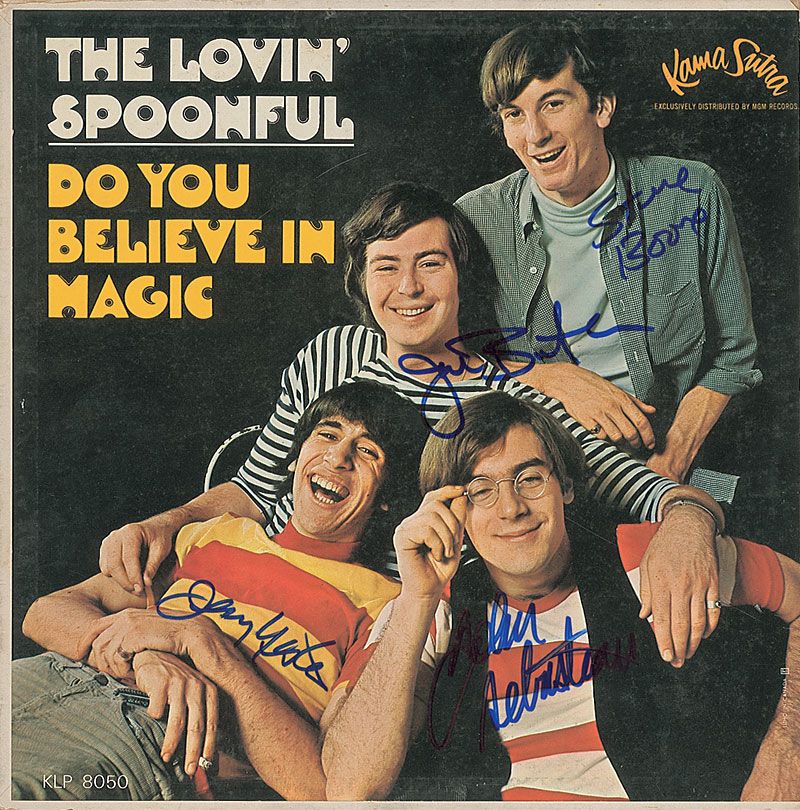 Do You Believe in Magic album signed on the front cover in blue felt tip by John Sebastian, Joe Butler, Steve Boone, and Jerry Yester. In fine condition. The record is not included.