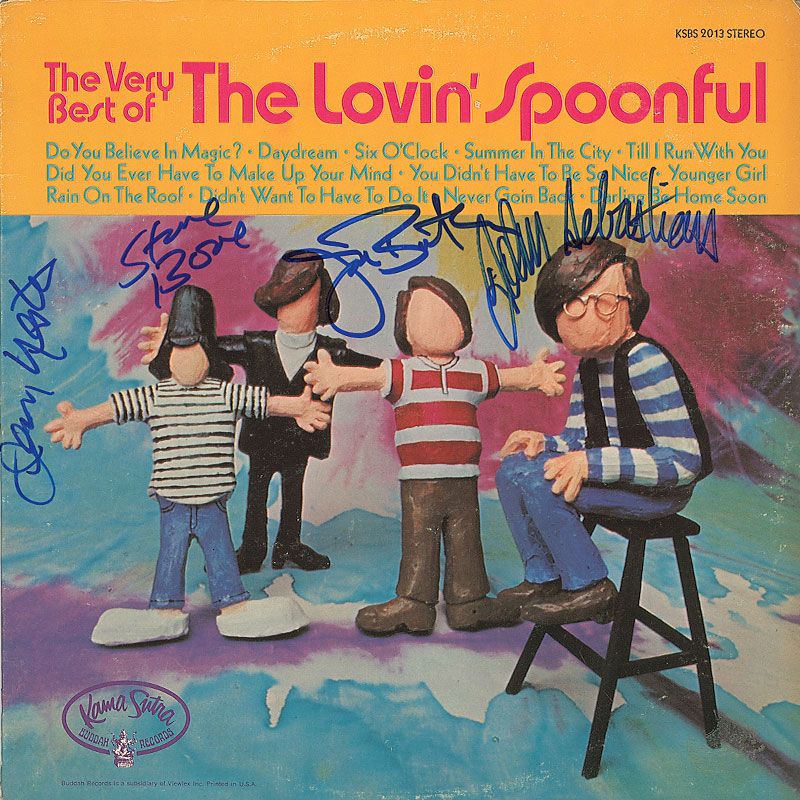The Very Best of the Lovin’ Spoonful album signed on the front cover in blue felt tip by John Sebastian, Steve Boone, Joe Butler, and Jerry Yester. Scattered cover and edge wear and a mild ‘ring of wear’ to cover, otherwise fine condition. The record is not included.
