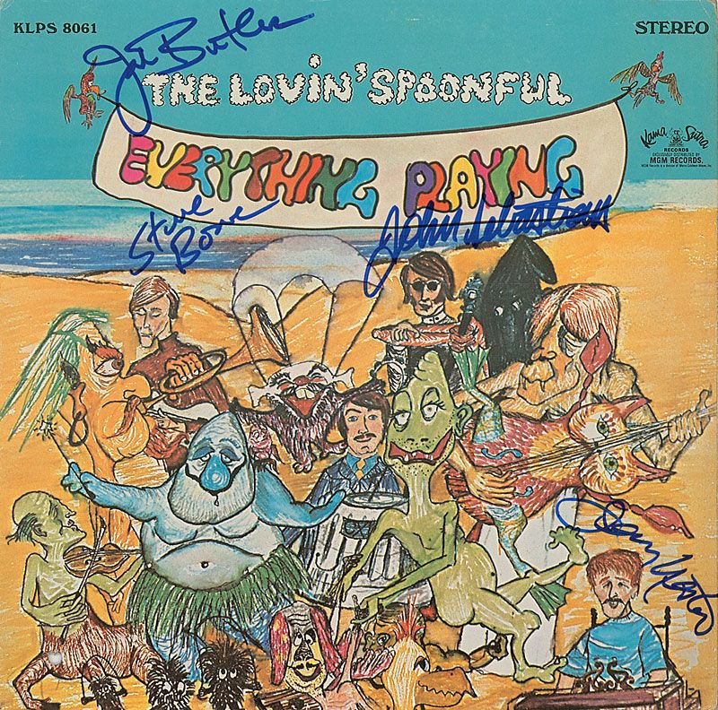 Everything Playing album signed on the front cover in blue felt tip by John Sebastian, Joe Butler, Steve Boone, and Jerry Yester. In fine condition. The record is not included.