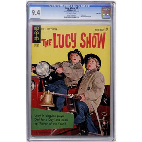 <B>The Lucy Show #2 File Copy (Gold Key, 1963) CGC NM 9.4 Off-white pages.</B></I> Photo cover. Back cover pin-up. CGC hasn't awarded a higher grade for this issue to date. CGC notes, "From the Random House Archives." Overstreet 2007 NM- 9.2 value = $110. CGC census 10/07: 3 in 9.4, none higher.<BR><BR><b>Shipping:</b> Comics - Slabbed (certified) (<a target="_blank" href="http://www.heritageauctions.com/common/shipping.php">view shipping information</a>)