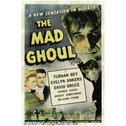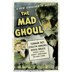 <B>The Mad Ghoul (Universal, 1943).</B></I> One Sheet (27" X 41"). This underappreciated Universal horror classic has an obsessed, evil scientist experimenting with an ancient Egyptian life-preserving process that preserves life after death, but only in a mindless zombie state! Many feel this was character actor George Zucco's definitive horror role. his obsession in the film is Evelyn Ankers, the perennial damsel in distress on the Universal lot, who screamed her way into a permanent place in the Horror Hall of Fame! There is fold line wear with small areas of paper loss, pinholes in the borders and surrounding graphics, paper loss in the corners and borders, and small tears. The poster has been restored, minimizing these defects. From the collection of Johnny Ramone. Very Good/Fine on Linen.