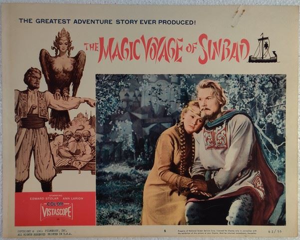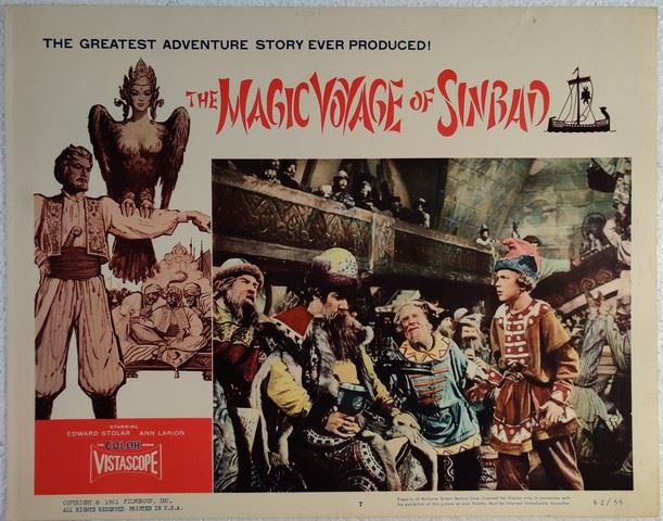 The Lost Voyage of Sinbad (Mosfilm, 1953) lobby card. Adventure, Fantasy. Starring Sergei Stolyarov, Alla Larionova, B. Surovtsev, Mikhail Troyanovsky, Nadir Malishevsky, Nikolay Kryuchkov, Ivan Pereverzev, Yuri Leonidov, Lev Fenin, Ninel Myshkova, Mikhail Astangov, Lidiya Vertinskaya, Stepan Kayukov, Olga Vikland, Sergei Martinson. Directed by Aleksandr Ptushko. Some edge wear, tearing, staining, tape. Very Good. (11"x14").