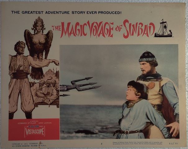 The Lost Voyage of Sinbad (Mosfilm, 1953) lobby card. Adventure, Fantasy. Starring Sergei Stolyarov, Alla Larionova, B. Surovtsev, Mikhail Troyanovsky, Nadir Malishevsky, Nikolay Kryuchkov, Ivan Pereverzev, Yuri Leonidov, Lev Fenin, Ninel Myshkova, Mikhail Astangov, Lidiya Vertinskaya, Stepan Kayukov, Olga Vikland, Sergei Martinson. Directed by Aleksandr Ptushko. Some edge wear, tearing, staining, tape. Very Good. (11"x14").