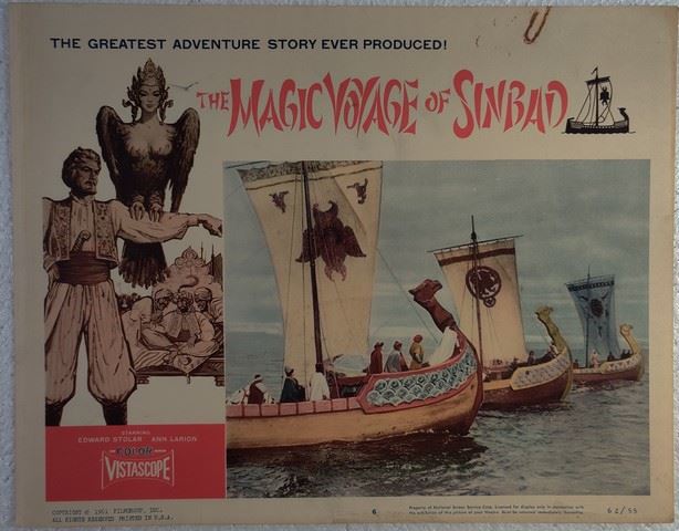 The Lost Voyage of Sinbad (Mosfilm, 1953) lobby card. Adventure, Fantasy. Starring Sergei Stolyarov, Alla Larionova, B. Surovtsev, Mikhail Troyanovsky, Nadir Malishevsky, Nikolay Kryuchkov, Ivan Pereverzev, Yuri Leonidov, Lev Fenin, Ninel Myshkova, Mikhail Astangov, Lidiya Vertinskaya, Stepan Kayukov, Olga Vikland, Sergei Martinson. Directed by Aleksandr Ptushko. Some edge wear, tearing, staining, tape. Very Good. (11"x14").
