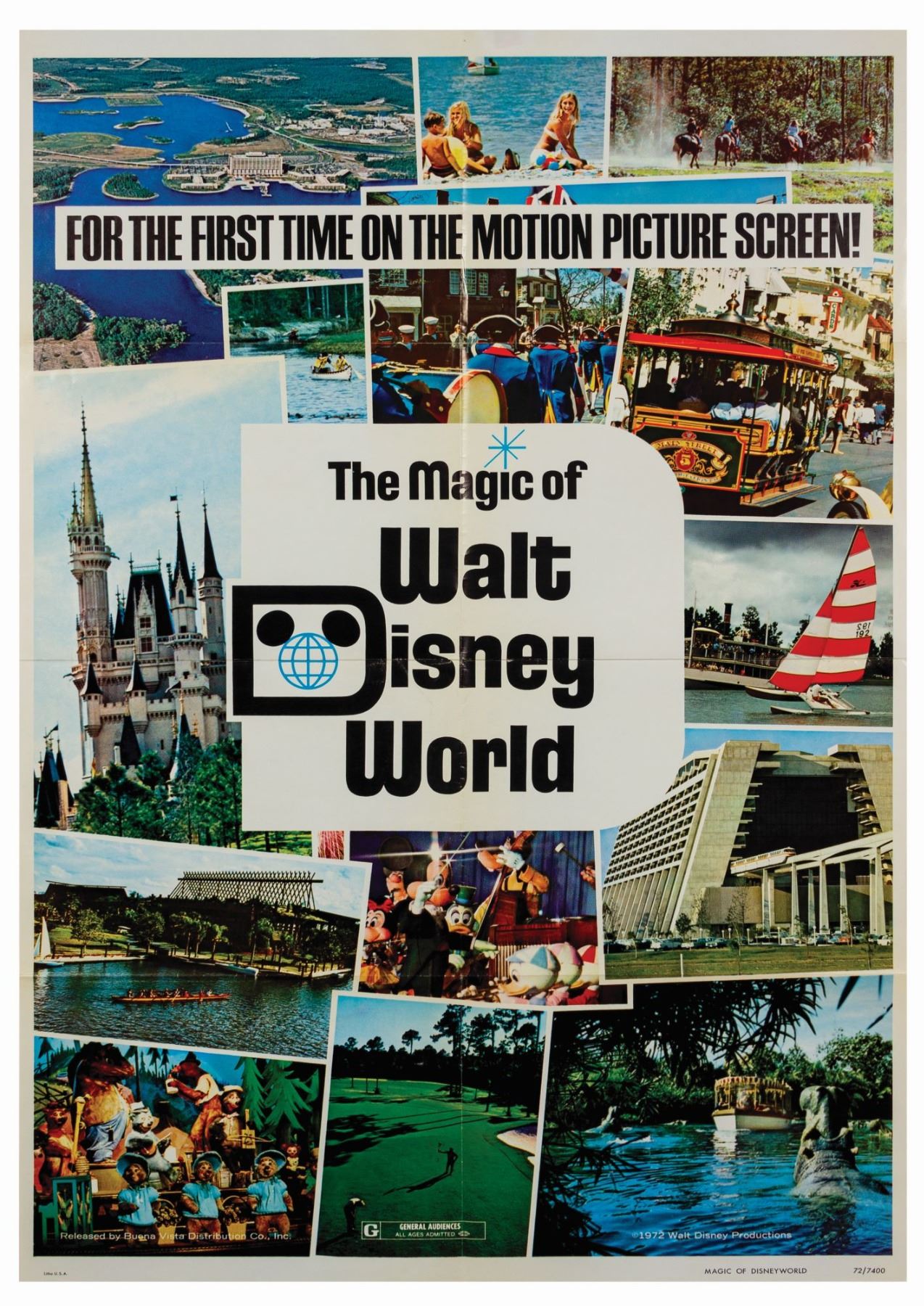 (Walt Disney World, 1972) A one-sheet poster promoting the theatrical release of the short film The Magic of Walt Disney World. Created within a year of the park's opening, this short was released to theaters alongside Saludos Amigos and Snowball Express in order to promote Walt Disney World. Full of great imagery from the park, the poster measures 41"x27". The condition is good with some wear to the original fold lines, edge-wear, and some scuffs to a few spots in the imagery from use.