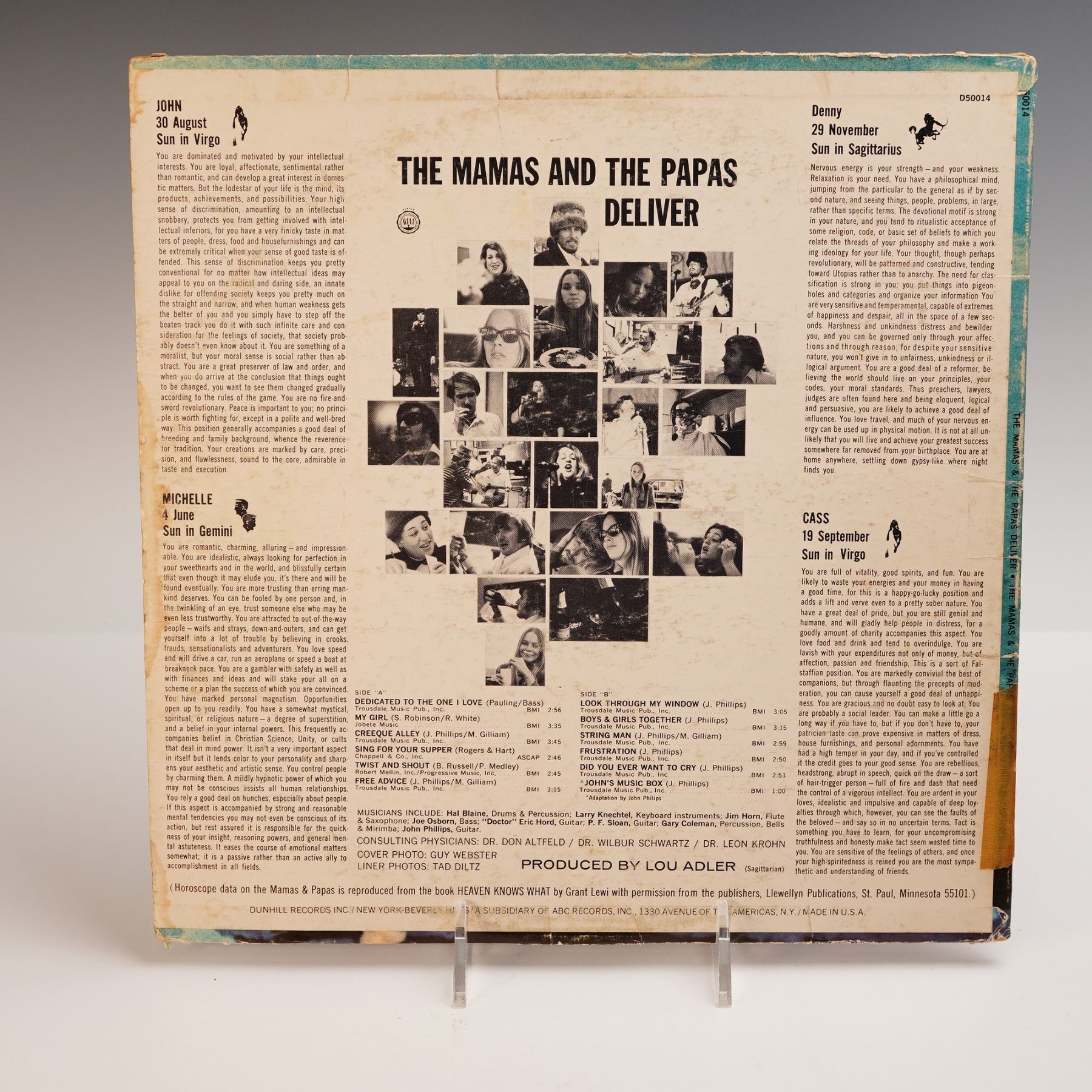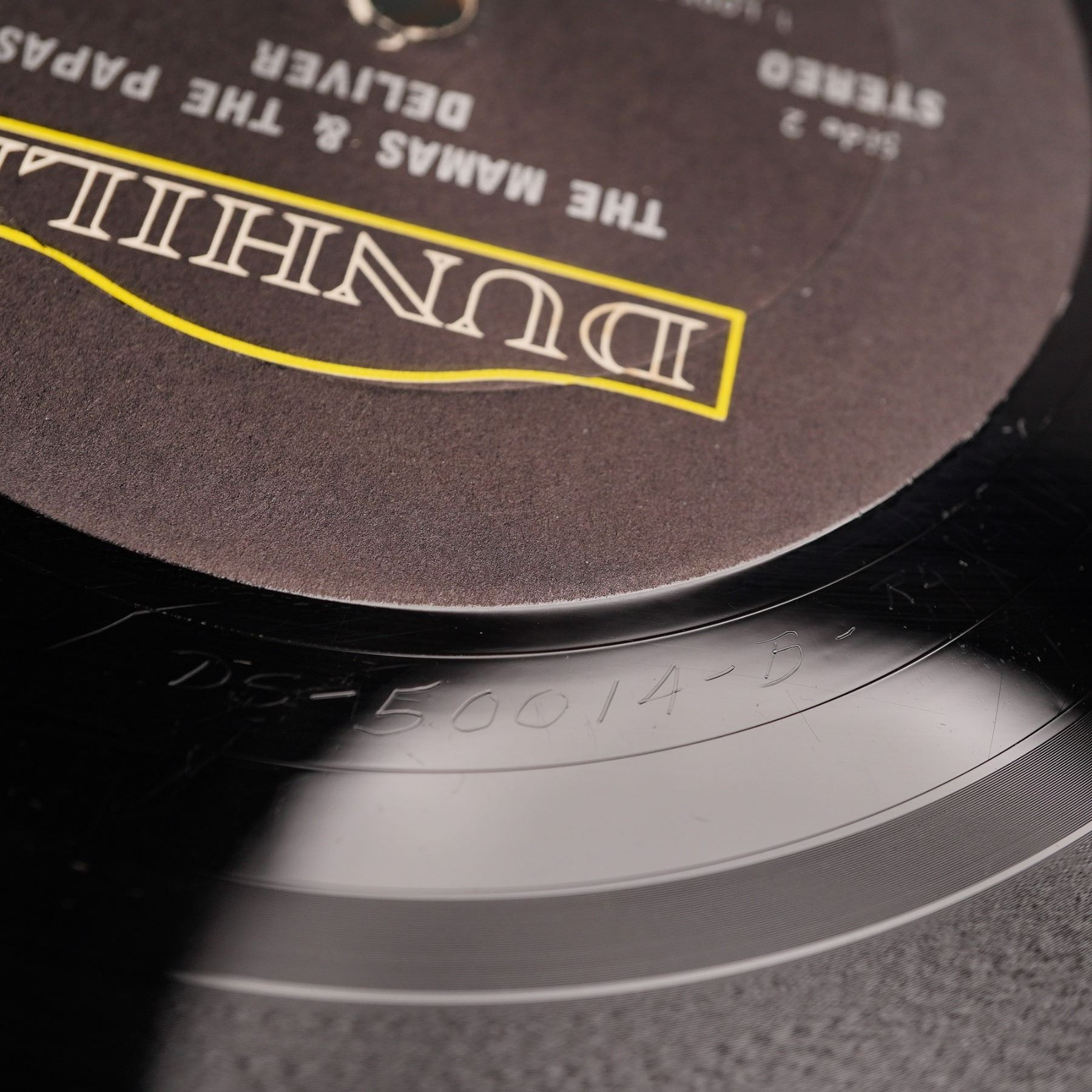 Vintage stereo LP of The Mamas and The Papas Deliver, issued by Dunhill Records, catalog number DS-50014. Features iconic cover art with the band members in a swimming pool scene and includes hit tracks such as Dedicated to the One I Love and Creeque Alley. The original sleeve displays a Gold Record Award seal and detailed liner notes on the reverse, profiling John, Michelle, Denny, and Cass. The vinyl shows matrix number DS-50014-B etched in the runout area, indicating a pressing from the original stereo release. Label marked with classic Dunhill branding. Measures 12.5"L x 12.5"H.
