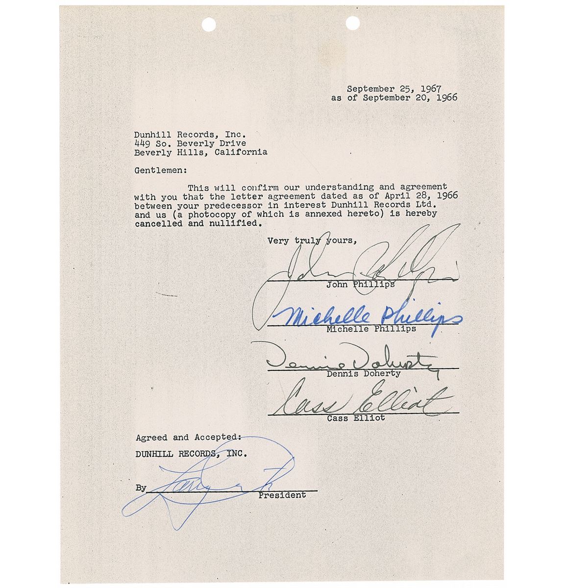 DS, one page, 8.5 x 11, September 25, 1967. Document canceling and nullifying a prior agreement with Dunhill Records. Signed at the conclusion in ink by John Phillips, Michelle Phillips, Dennis Doherty, and Cass Elliot, and countersigned by the president of Dunhill Records. Punch and staple holes to top edge, two small tears to right edge, and trivial creasing, otherwise fine condition.