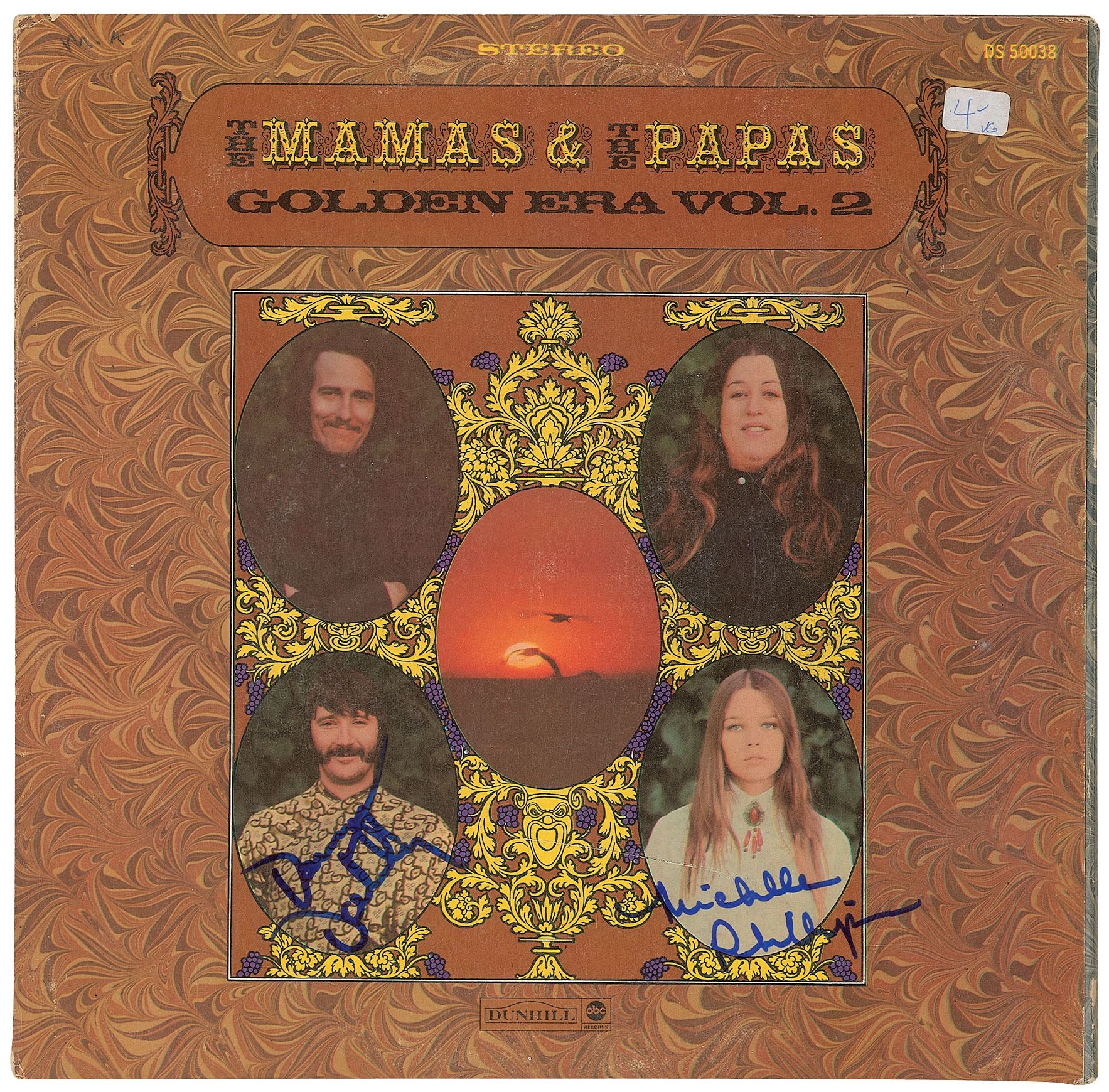 The Mamas & the Papas: Golden Era Vol. 2 album signed on the front cover in blue felt tip by Denny Doherty and Michelle Phillips. In fine condition, with an affixed price sticker. The record is not included.