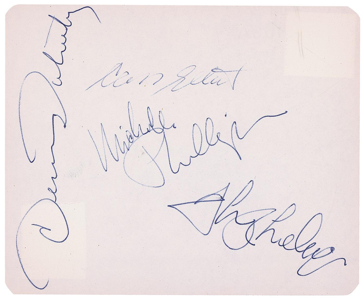 Ballpoint signatures of all four members of The Mamas & The Papas—Cass Elliot, John Phillips, Michelle Phillips, and Denny Doherty—on a white 5.5 x 4.5 album page affixed to a larger piece of cardboard. In fine condition, with skipping to Elliot’s signature and show-through at two corners from mounting tape on reverse. RRAuction COA.