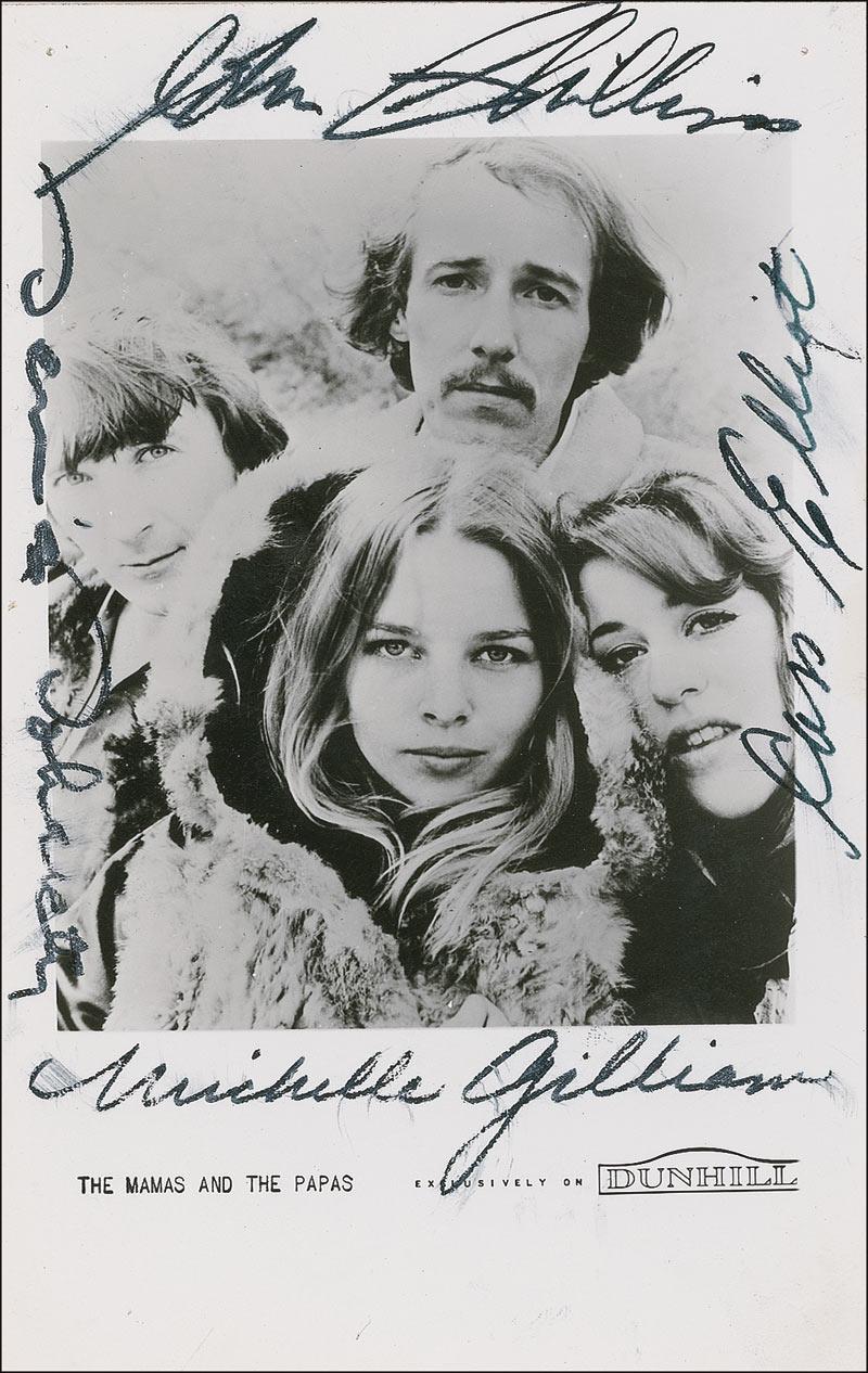 Rare vintage 3.5 x 5.5 cardstock group photo, signed in the borders in black ink by Cass Elliot, John Phillips, Denny Doherty, and Michelle Phillips, signed “Michelle Gilliam.” Scattered irregular ink adhesion to each signature, as well as a few brushes, otherwise fine condition. Quite uncommon in signed photos.