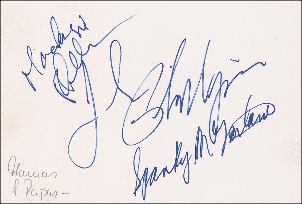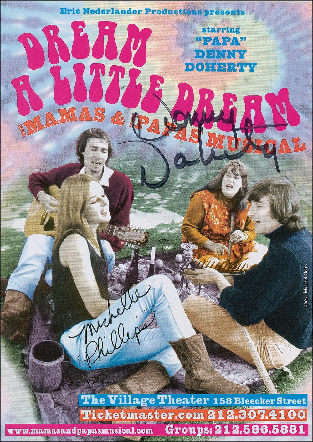 Two items: color 5 x 7 cardstock advertisement for Dream a Little Dream, signed in black felt tip by Denny Doherty and Michelle Phillips; and felt tip signatures of John Phillips, and later members Spanky McFarlane and Mackenzie Phillips on an off-white 6 x 4 card. In fine condition.