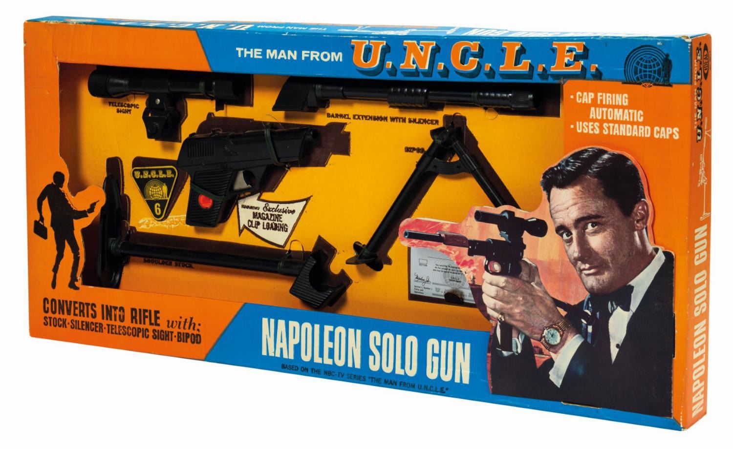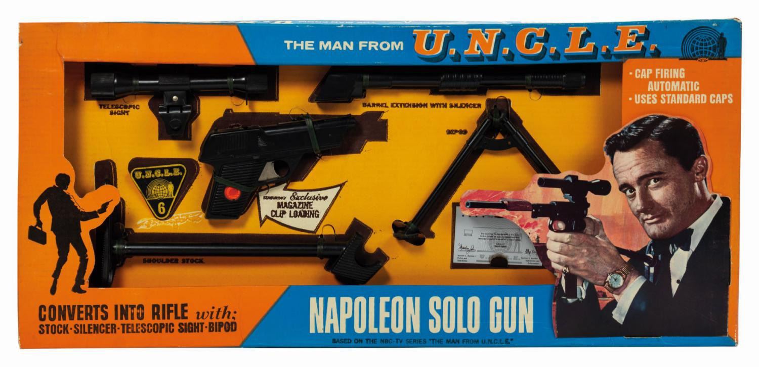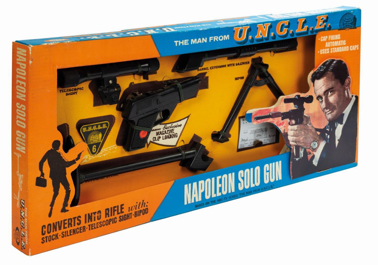 (Ideal, 1965) A vintage The Man From U.N.C.L.E. Napoleon Solo Gun Set manufactured by Ideal. Constructed of metal and plastic, the set includes a magazine clip loading cap pistol with accessories to convert it into a covert operations rifle. Never opened, all items are assembled in their original cardboard packaging. Measuring 14"x30.75" and 2.25" deep, the packaging is in fine condition with some stress line and minor shelf wear. The weapon components are as-new.