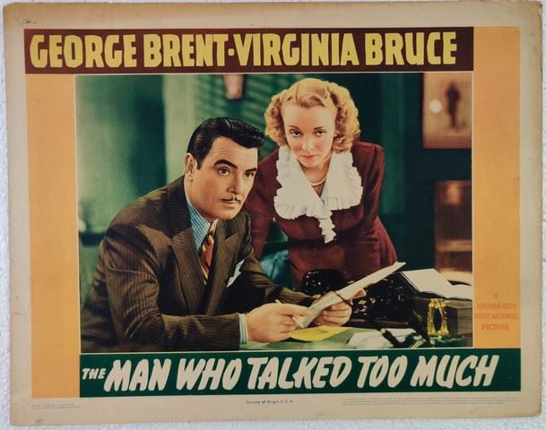 The Man Who Talked Too Much (Warner Bros., 1940) lobby card. Drama, Crime. Starring George Brent, Virginia Bruce, Brenda Marshall, Richard Barthelmess, William Lundigan, George Tobias, John Litel, Henry Armetta, Alan Baxter, David Bruce, Clarence Kolb, Marc Lawrence, Louis Jean Heydt, Edwin Stanley, William Hopper. Directed by Vincent Sherman. Edge wear, creases, tearing, pin-holes, light staining, light paper loss. Fair. (11"x14").
