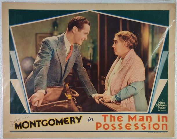 The Man in Possession (Metro-Goldwyn-Mayer [MGM], 1931) lobby card. Comedy. Starring Robert Montgomery, Charlotte Greenwood, Irene Purcell, C. Aubrey Smith, Beryl Mercer, Reginald Owen, Alan Mowbray, Maude Eburne, Forrester Harvey, Yorke Sherwood. Directed by Sam Wood. Very light edge wear, light creases. Very Fine. (11"x14").