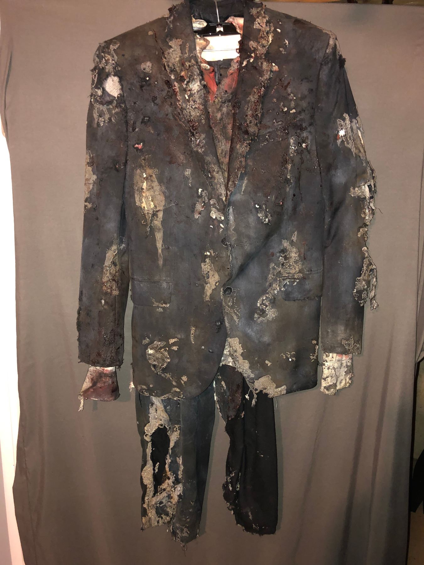 Description: Franks blown up S2 costume with jacket, shirt and trousers in distressed condition.