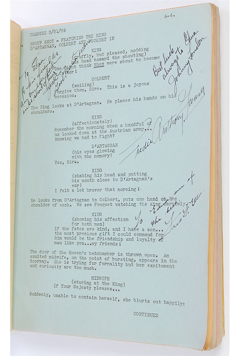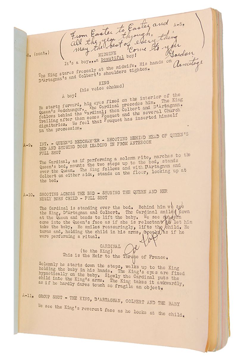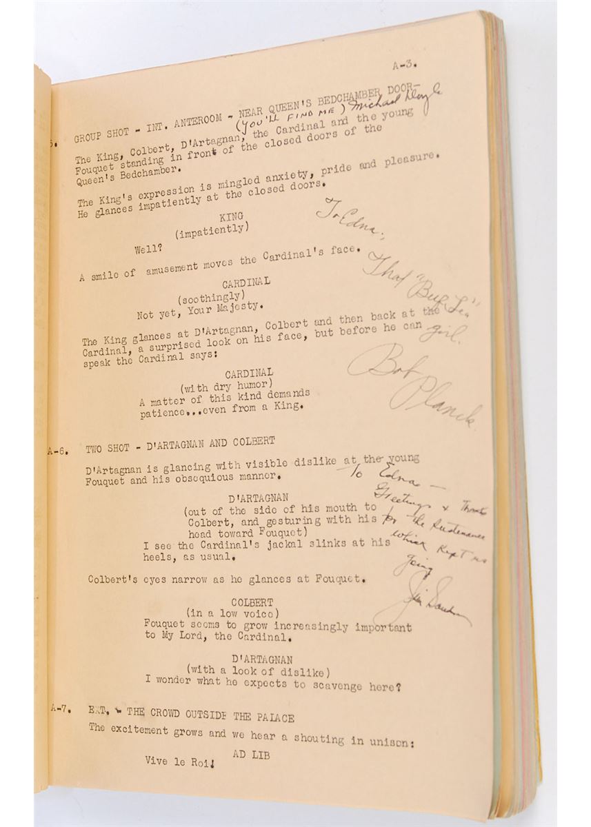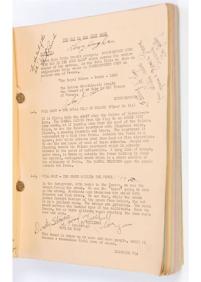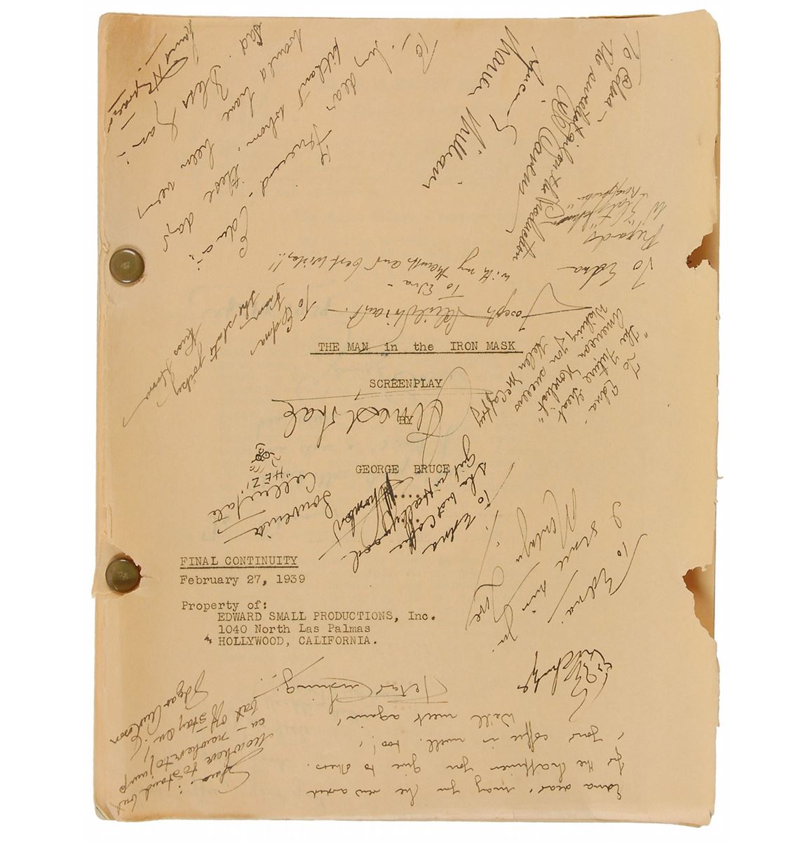 Original brad-bound final continuity screenplay for the 1939 film The Man by in the Iron Mask by George Bruce, 8.5 x 11, February 27, 1939. Signed and inscribed by approximately 50 cast and crew members on various pages throughout the script (with several signing upside down on the title page), including: director James Whale, Peter Cushing, Joseph Schildkraut, I. Stanford Jolley, Louis Hayward, and George Bruce. In very good condition, with significant tears, creases, and toning to loose front cover and title page, with the remainder of the script clean and intact. Directed by James Whale—who previously tackled horror classics like Frankenstein (1931) and The Bride of Frankenstein (1935)—this initial full-sound adaptation of the Alexandre Dumas story is notable for containing Peter Cushing’s motion picture debut. Whale is a notably uncommon and desirable horror autograph.
