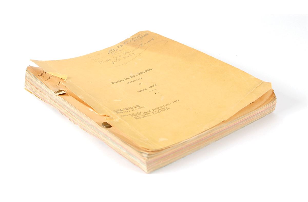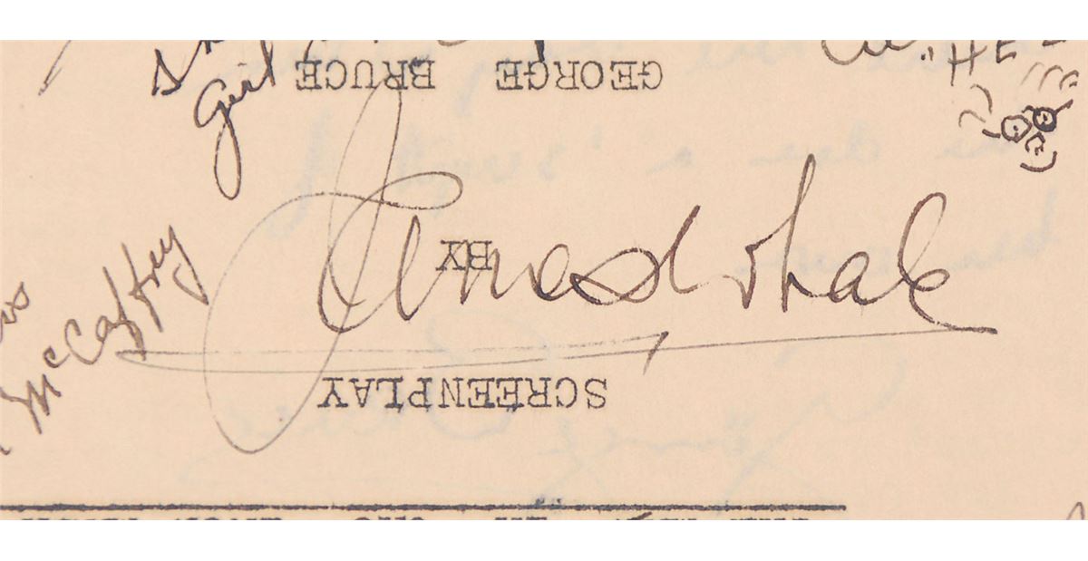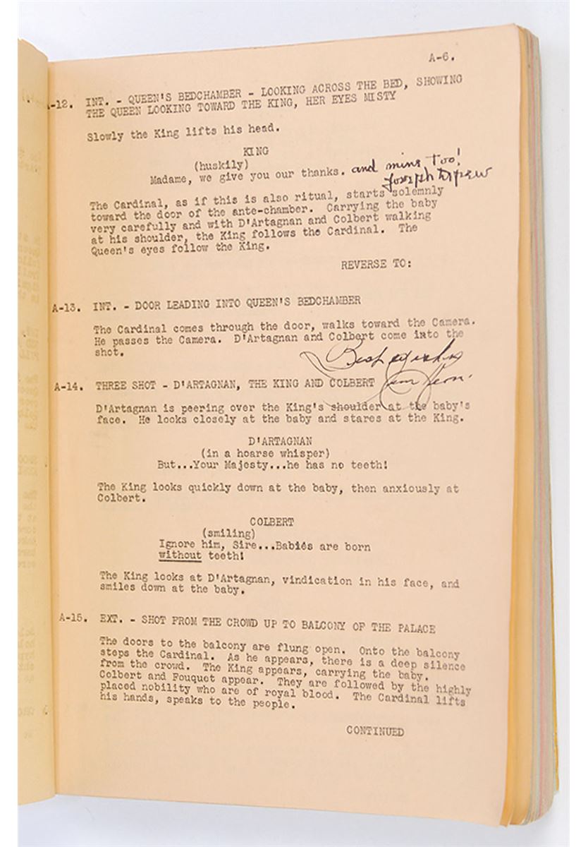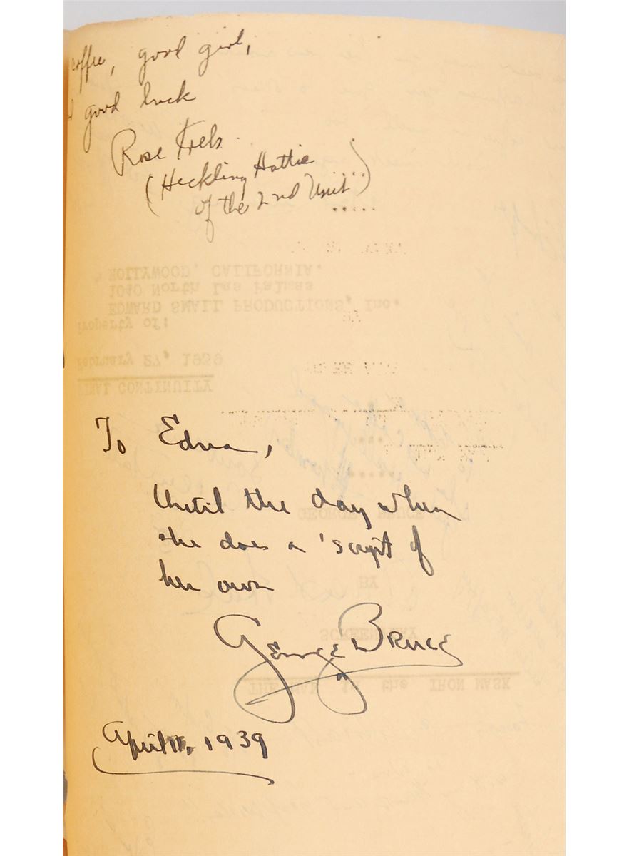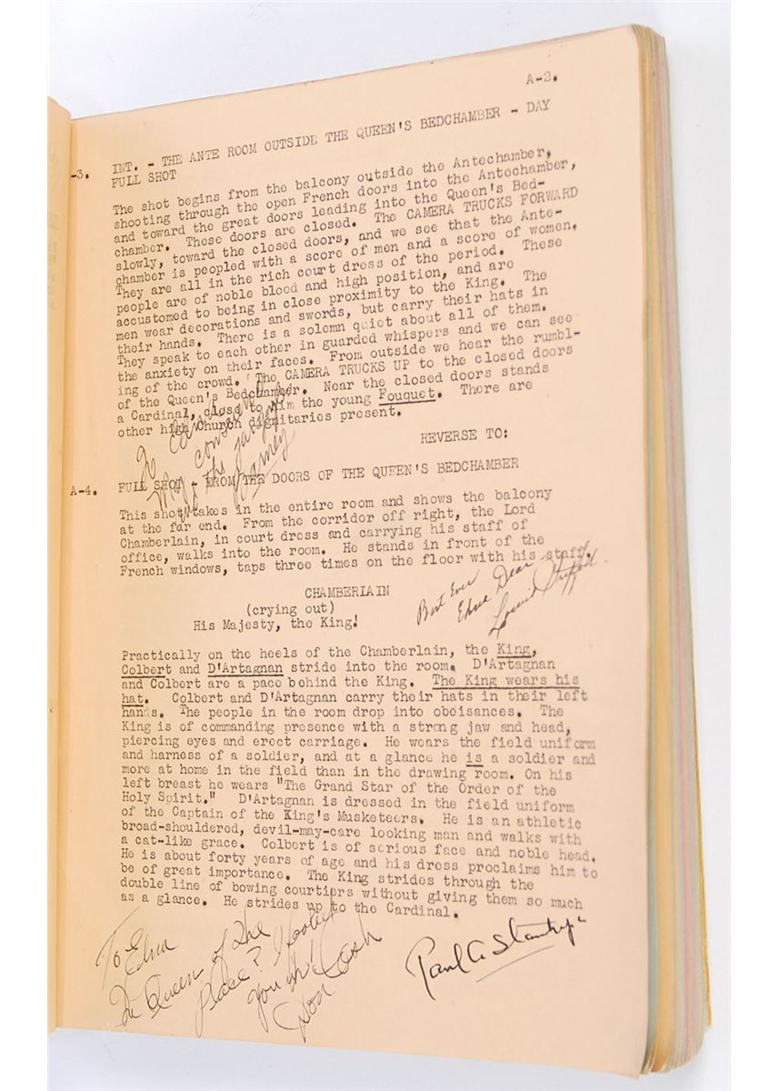 Original brad-bound final continuity screenplay for the 1939 film The Man by in the Iron Mask by George Bruce, 8.5 x 11, February 27, 1939. Signed and inscribed by approximately 50 cast and crew members on various pages throughout the script (with several signing upside down on the title page), including: director James Whale, Peter Cushing, Joseph Schildkraut, I. Stanford Jolley, Louis Hayward, and George Bruce. In very good condition, with significant tears, creases, and toning to loose front cover and title page, with the remainder of the script clean and intact. Directed by James Whale—who previously tackled horror classics like Frankenstein (1931) and The Bride of Frankenstein (1935)—this initial full-sound adaptation of the Alexandre Dumas story is notable for containing Peter Cushing’s motion picture debut. Whale is a notably uncommon and desirable horror autograph.