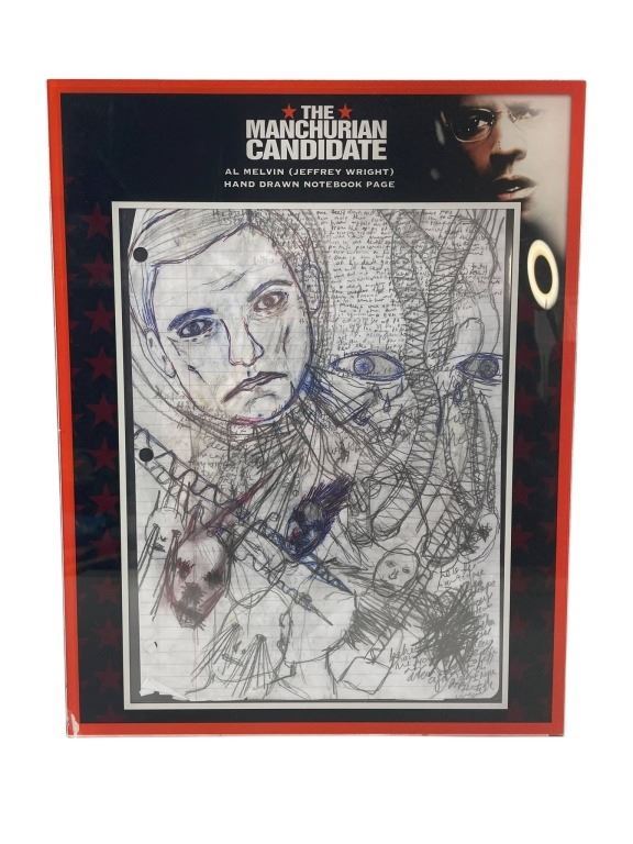 Original screen-matched notebook page (framed) hand drawn by "Al Melvin", played by Jeffrey Wright in the production of the Jonathan Demme directed neo-noir psychological political thriller film 'The Manchurian Candidate' (1962), which stars Denzel Washington as Bennett Marco, a tenacious, virtuous soldier, Liev Schreiber as Raymond Shaw, a U.S. Representative from New York, manipulated into becoming a vice-presidential candidate, Jon Voight as U.S. Senator Tom Jordan, a challenger for Vice President, and Meryl Streep as Eleanor Prentiss Shaw, also a U.S. Senator and the manipulative, ruthless mother of Raymond Shaw.