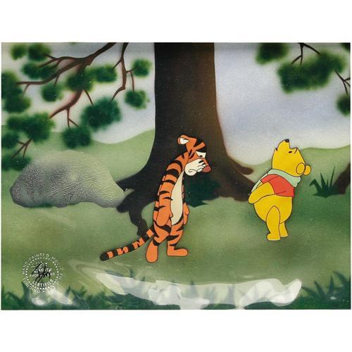 <B>"The Many Adventures of Winnie the Pooh" Production Cel Original Art (Walt Disney, 1977).</B></I> Experience the magic of Winnie the Pooh's first and most beloved feature film in this hand painted animation cel, featuring the lovable bear, and his friend, Tigger. This cel has an image area of 13" x 10", and also includes a hand painted background. In Excellent condition. Includes a Disney seal, and a certificate of authenticity.