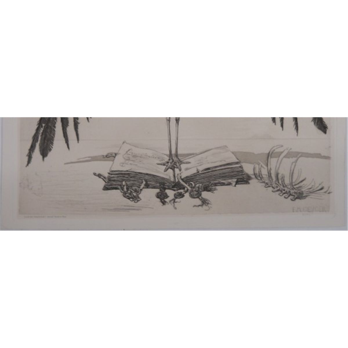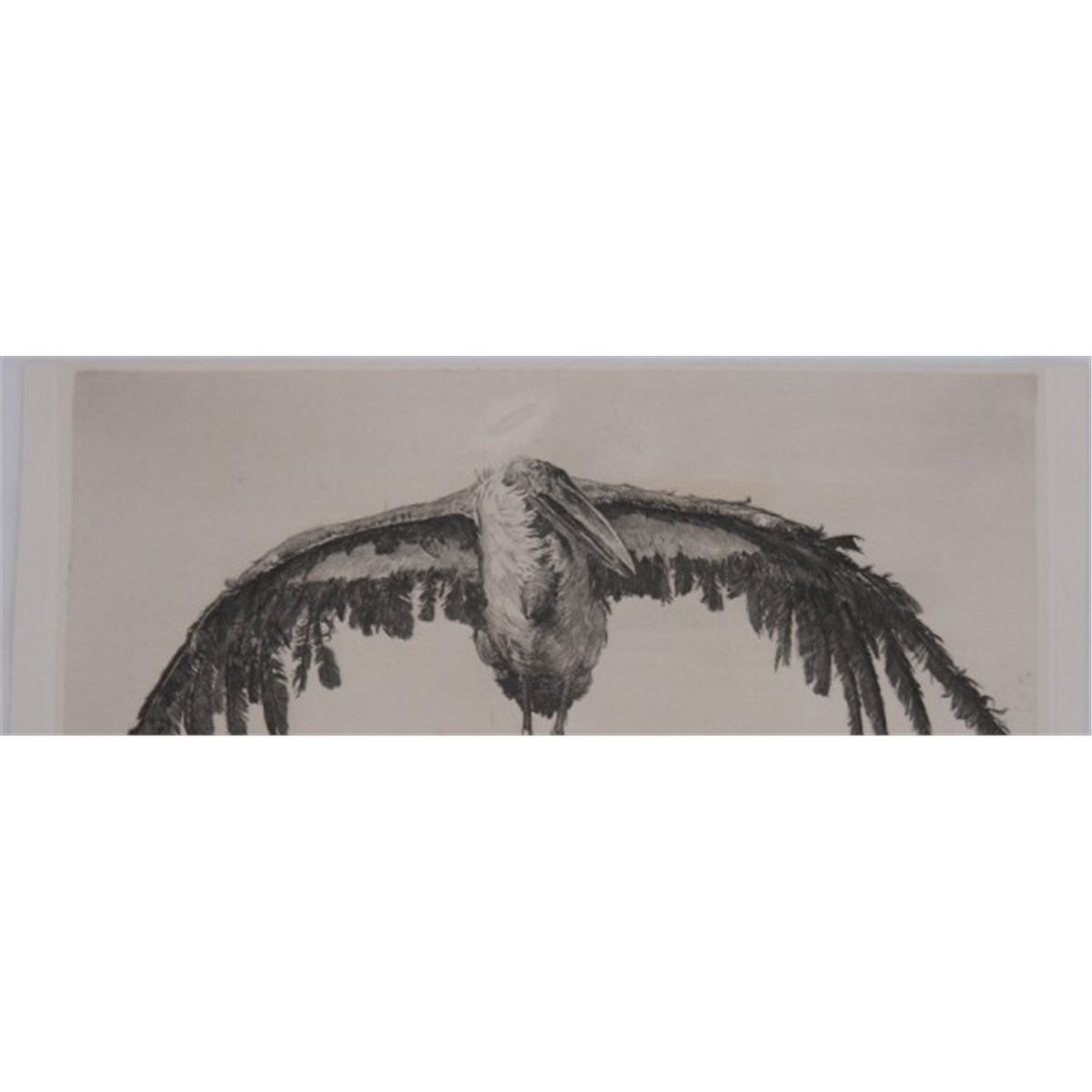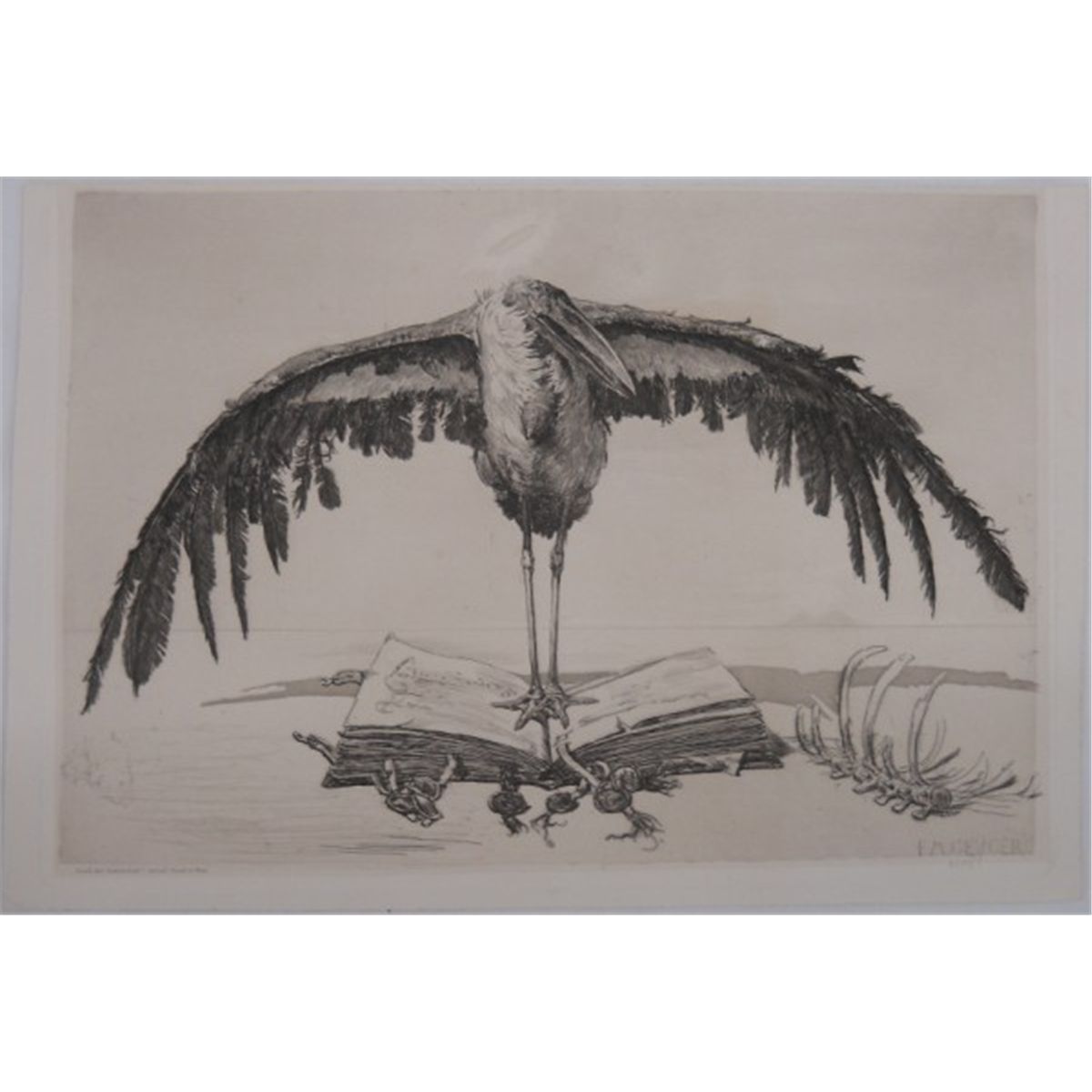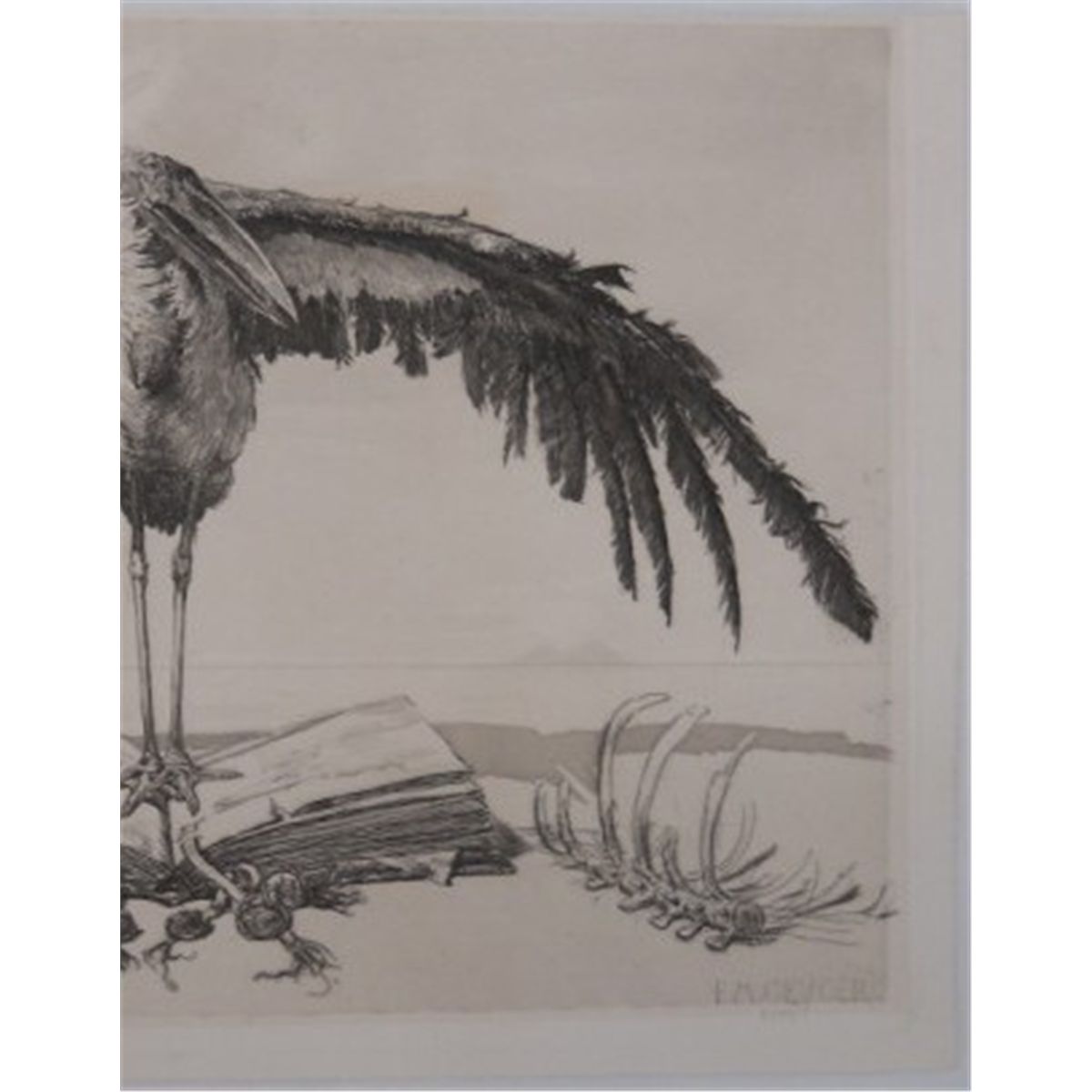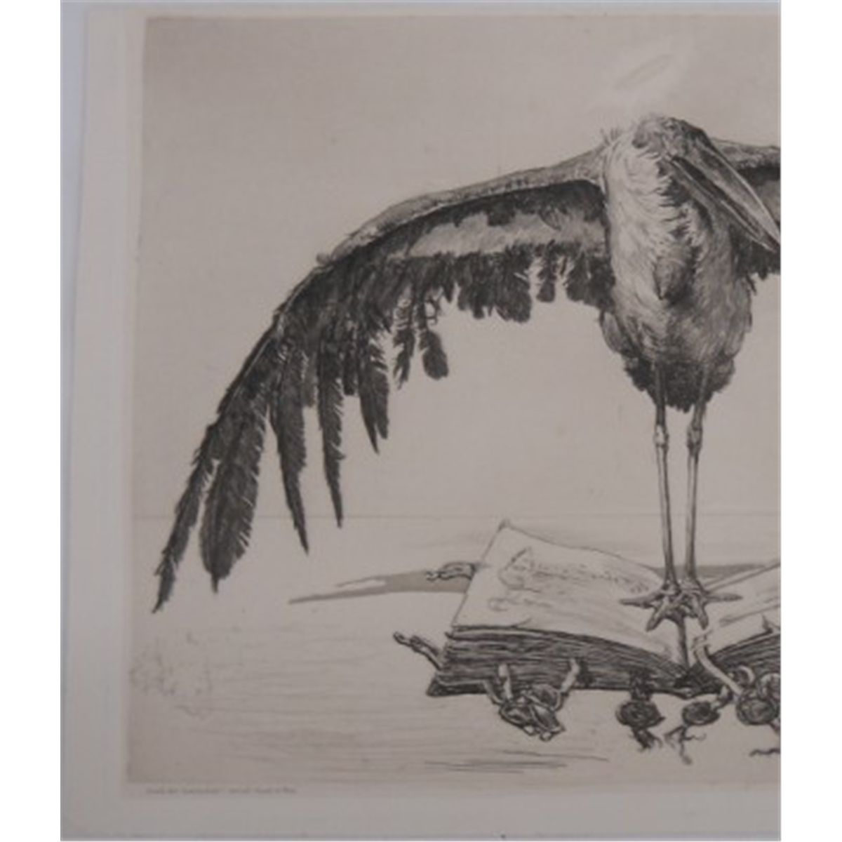 "The Marabou Stork" by Geyger Ernst Moritz, a German sculptor, painter and etcher (1861-1941). He is regarded as a representative of the Berlin school of sculpture. Photogravure, signed on plate "E. M. Geyger, 1886". This is 14 1/4" x 9 3/4". There is a scratch tear on the back.