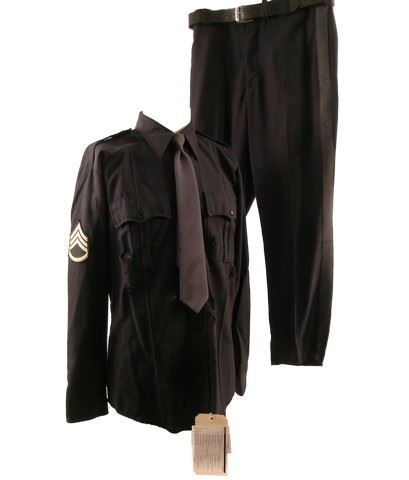 Eckert (Michael Eklund) screen worn, hero, multiple bullet holes with blood, navy blue long sleeve button front with patches on the sleeves 'Somer's Uniforms' shirt, (size 17/36) black leather uniform belt, grey clip on neck tie, and navy flat front with stripes on the side 'Fechimer' pants. Includes wardrobe tag!