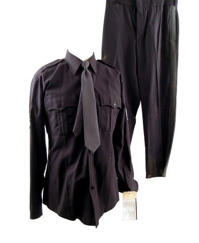 Eckert (Michael Eklund) screen worn, hero, very worn, navy blue long sleeve button front with patches on the sleeves 'Somer's Uniforms' shirt, (size 17/36) faded white short sleeve crew neck 'Calvin Klein' t-shirt, (size S) grey clip on neck tie, and navy flat front with stripes on the side 'Fechimer' pants. Includes wardrobe tag!