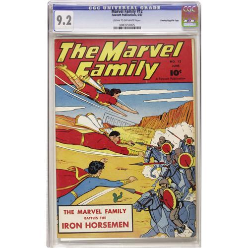 <B>The Marvel Family #12 Crowley Copy/File Copy (Fawcett, 1947) CGC NM- 9.2 Cream to off-white pages.</B></I> Checking Copy stamp on cover. Overstreet 2006 NM- 9.2 value = $340. CGC census 10/06: 1 in 9.2, none higher.<BR><BR><b>Shipping:</b> Slabbed Comic (<a target="_blank" href="http://www.heritageauctions.com/common/shipping.php">view shipping information</a>)
