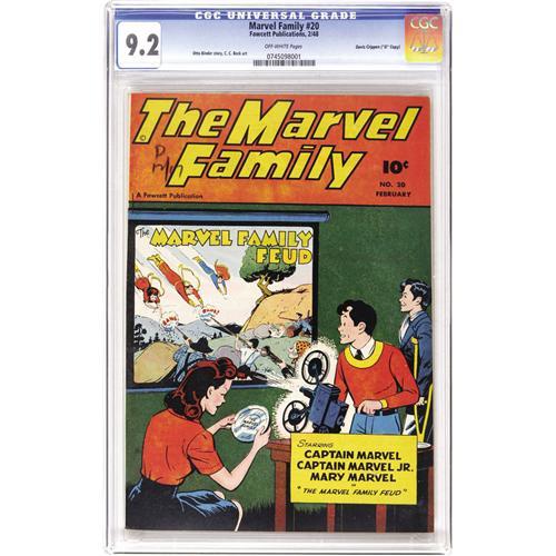 <B>The Marvel Family #20 Davis Crippen ('D" Copy) pedigree (Fawcett, 1948) CGC NM- 9.2 Off-white pages.</B></I> C. C. Beck provided the art for this Marvel Family outing. Overstreet 2006 NM- 9.2 value = $340. CGC census 6/06: 1 in 9.2, 1 higher. <I>From the Crippen Collection.</B></I> <BR><BR><B>Important notice:</B> Heritage usually auctions material at the rate of 200-250 lots per hour. On some occasions eBay Live bid software or the Internet may not be able to keep up with the pace of the auction. We recommend placing a realistic absentee bid now as insurance to avoid disappointment. Occasionally the auctioneer may eliminate or reject an eBay Live bid, and the auctioneer may also reopen a lot after the close of the eBay live bidding (usually because we missed an audience bid), and may reject your bid even if it shows you as the winning bidder. By bidding via eBay Live, you agree that Heritage may award the lot to another bidder at its sole discretion under the circumstances described above or any other reasonable circumstances. Since eBay bids are not shown to us until we open the lot on the floor, we treat those bids just like floor bids. In most cases the floor responds before the eBay bid is presented to us, due to Internet lag time, so for consistency we have made it a policy that floor bids are always considered first over tie eBay live bids. Also please note that all Heritage lots purchased through eBay Live carry a 22.5% Buyer's Premium. Please make sure you read the Terms and Conditions before you bid. This lot is being auctioned in conjunction with a live floor auction by Heritage Auction Galleries. All final auction and invoice information will be supplied by Heritage Auction Galleries, and all other information should be considered preliminary. Lot:41001 <BR><BR><B>Winning Notification and Billing:</B> After the FINAL session in this auction is complete, Heritage will send e-mail and snail mail invoices. This process normally takes several days. All final auction and invoice information will be supplied by Heritage Auction Galleries, and all other information should be considered preliminary. <BR><BR>This auction will be conducted on a live auction floor and over the Internet through eBay Live. If you choose to place an absentee bid, please take a moment to <font color='#0000ff'><u><a href='http://pages.ebay.com/liveauctions/help/before/laabsentee.html'>learn how eBay Live absentee bidding works</a></u></font><font color='#000000'>