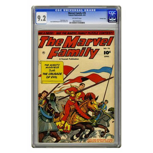 <B>The Marvel Family #70 Crowley Copy pedigree (Fawcett, 1952) CGC NM- 9.2 Off-white pages.</B></I> Pete Costanza illustrated this issue's cover, for the three-part "Crusade of Evil" story. The interior art is by Kurt Schaffenberger. CGC currently lists only this copy in its census report for this issue. Overstreet 2005 NM- 9.2 value = $160. CGC census 12/05: 1 in 9.2, none higher.