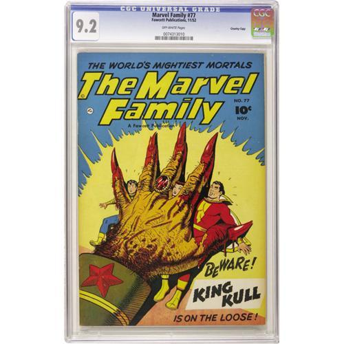 <B>The Marvel Family #77 Crowley Copy pedigree (Fawcett, 1952) CGC NM- 9.2 Off-white pages.</B></I> Communist threat cover. King Kull appearance. Overstreet 2006 NM- 9.2 value = $275. CGC census 10/06: 1 in 9.2, none higher.<BR><BR><b>Shipping:</b> Slabbed Comic (<a target="_blank" href="http://www.heritageauctions.com/common/shipping.php">view shipping information</a>)
