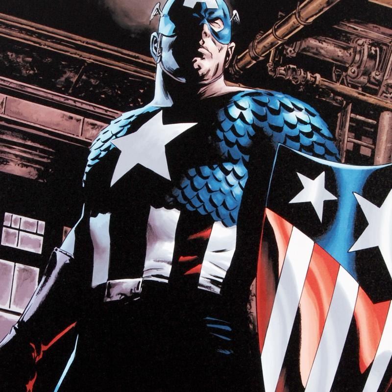 A piece of comic book history, this limited edition, from original art by Steve Epting, depicts the heroic Captain America. Steve Epting began working with Marvel Comics in the early 1990s; his first assignment was a six part Avengers series, thereafter he became a full time penciler on the Avengers. More recently Epting has been working on the Fantastic Four as well as Captain America. "The Marvels Project #5" is a limited edition numbered giclee on stretched canvas by Steve Epting presented by Marvel Comics. This piece comes gallery wrapped. Includes Certificate of Authenticity! Measure approx. 18" x 27" (image); 1.5" (depth).