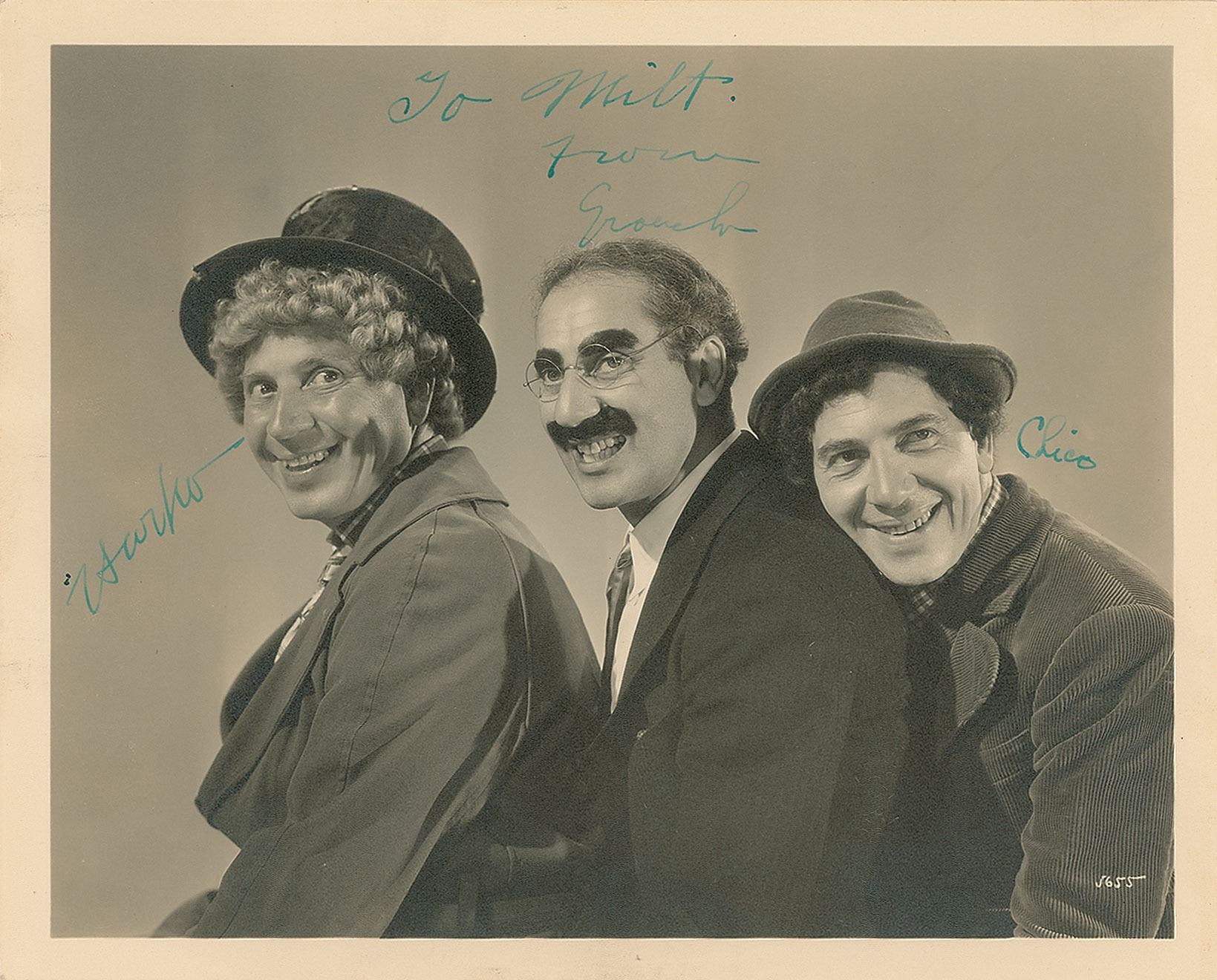Vintage matte-finish 10 x 8 studio photo of the three elder Marx Brothers, signed and inscribed in green fountain pen, "To Milt, from, Groucho," "Harpo," and "Chico.” Reverse bears an MGM stamp crediting the photo to Ted Allan. In fine condition. A superb example of the classic Marx Brothers core, made all the more desirable by its evenly spaced autographs, bold green ink, and exceptionally clean condition.