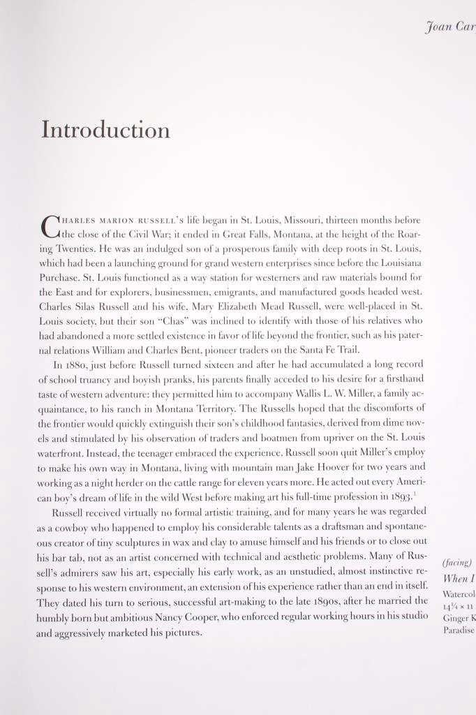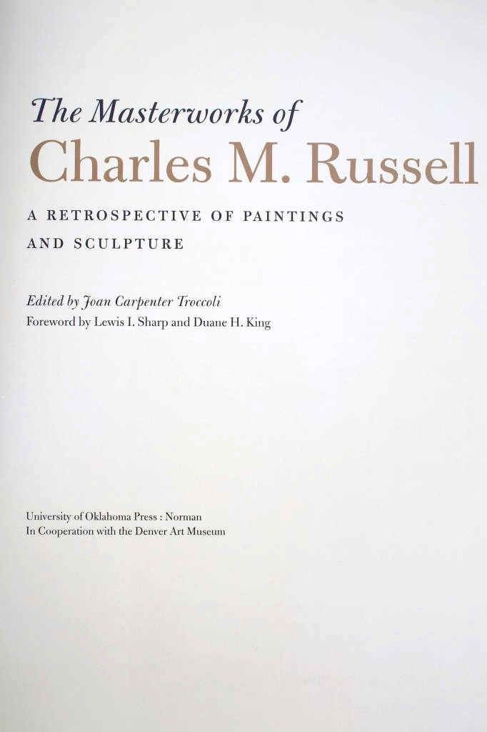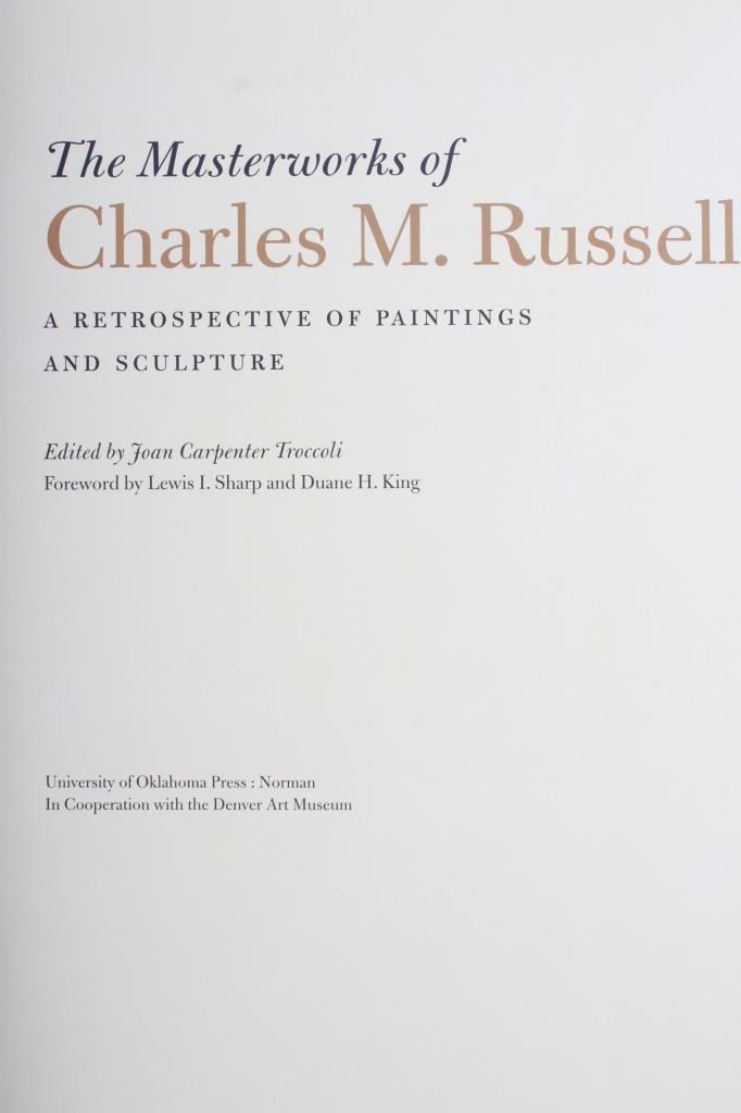 This lot is the book, "The Masterworks Of Charles M. Russell, A Retrospective Of Paintings and Sculpture", edited by Joan Carpenter Troccoli 2009, University of Oklahoma Press, Norman; a handsome book which showcases many of his best known works and chronicles the sources and evolution of his style. The book accompanied exhibitions, of Russell's works, at both the Gilcrease Museum (Tulsa, OK) and the Denver Art Museum (Denver, CO). This is also a companion volume to the acclaimed, "Charles M. Russell: A Catalogue Raisonné", edited by B. Byron Price.
