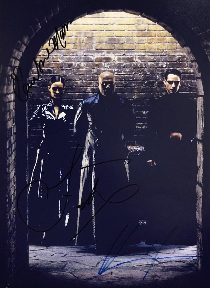 The Matrix cast signed movie photo autographed by Keanu Reeves, Laurence Fishburne, and Carrie- Anne Moss. 8x10 inches.
