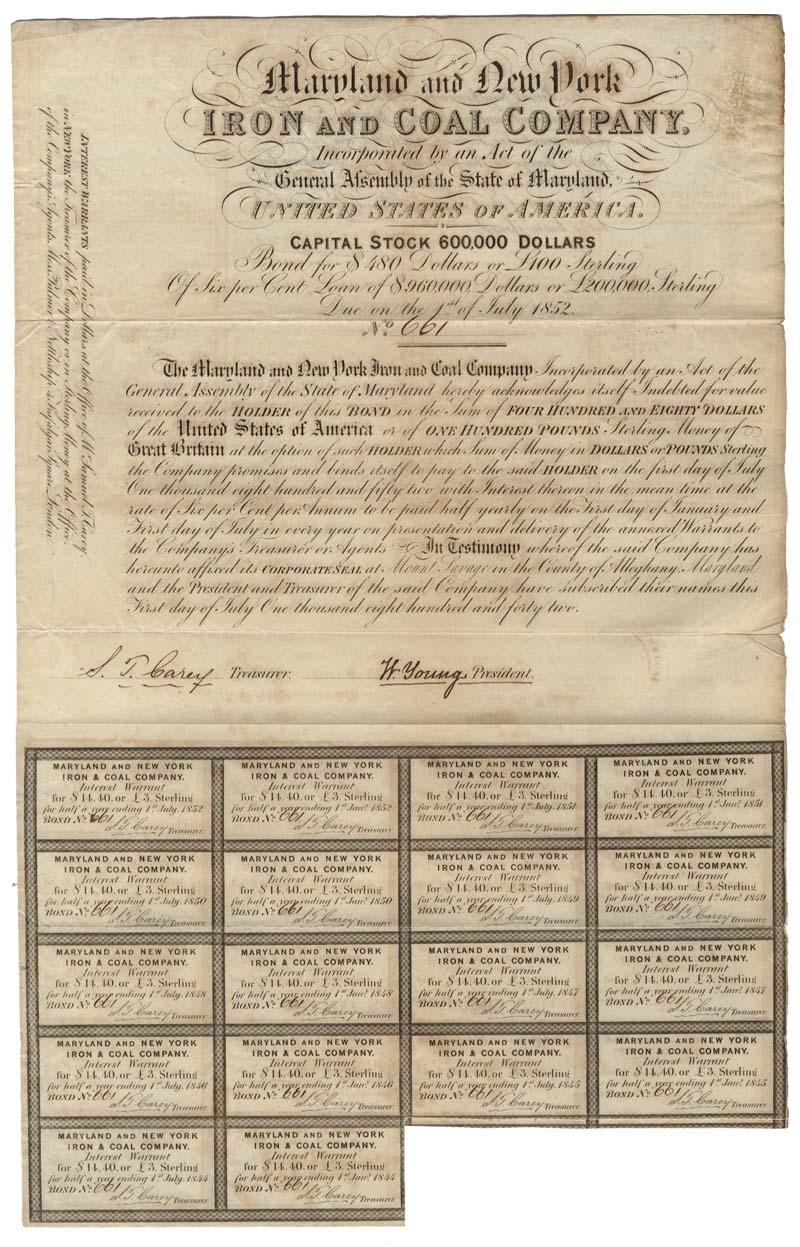 1842, Maryland. Bond for 100 pounds or $480 bearing 6% interest. Black. Coupons below. Measures 10 ¾” x 17”. The company was incorporated in 1837 and authorized by the Maryland legislature under and act passed March 12, 1838. Originally established by Benjamin Howell, an Englishman, the company grew to be a highly successful operation. It constructed the Mount Savage Iron Works producing about 200 tons of iron a week. Additionally, the company built the Mount Savage Railroad which connected Cumberland to the B & O Railroad. At the time, it was the only company in the United States producing heavy railroad iron. One fold at center. Excellent.
