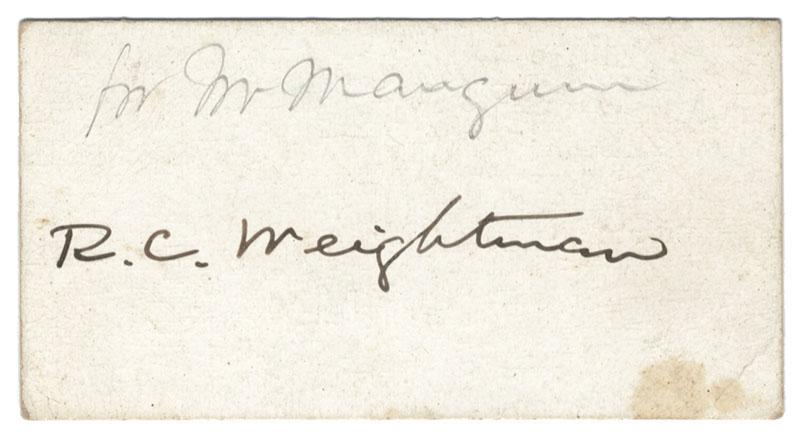 Roger Chew Weightman (1787 - 1876) American politician, civic leader, and printer. He was the mayor of Washington, D.C. from 1824 to 1827. Chew was the recipient of the last letter written by Jefferson Davis. 3” x 1 ½”. Signed card “ R.C. Weightman”. A pencil notation indicates the card was presented to Senator “(Willie Person) Mangum”. Soiling at bottom margin. Overall Fine.