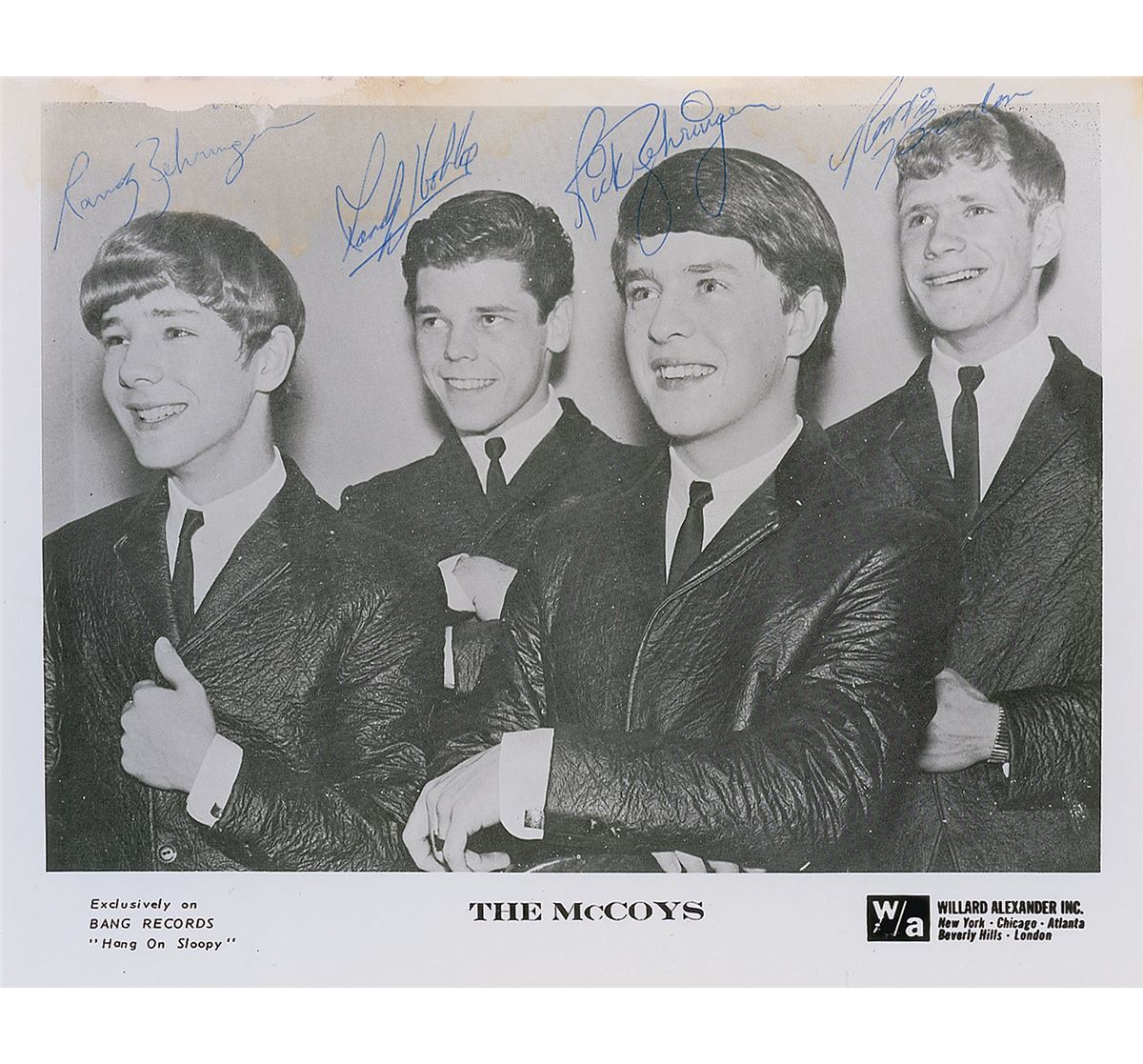 Indiana rock group best known for their 1965 single ‘Hang On Sloopy.’ Uncommon glossy 10 x 8 Willard Alexander publicity photo of The McCoys, signed in blue ballpoint by Rick Zehringer, Randy Zehringer, Ronnie Brandon, and Randy Jo Hobbs. In very good condition, with dampstaining and surface loss to upper portion (affecting portions of the signatures). Originates from the collection of record producer and entertainer Timothy D. Kehr.
