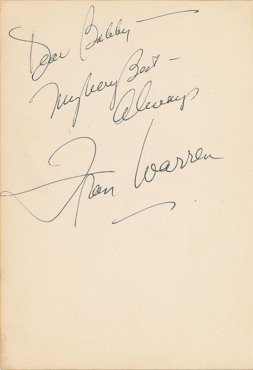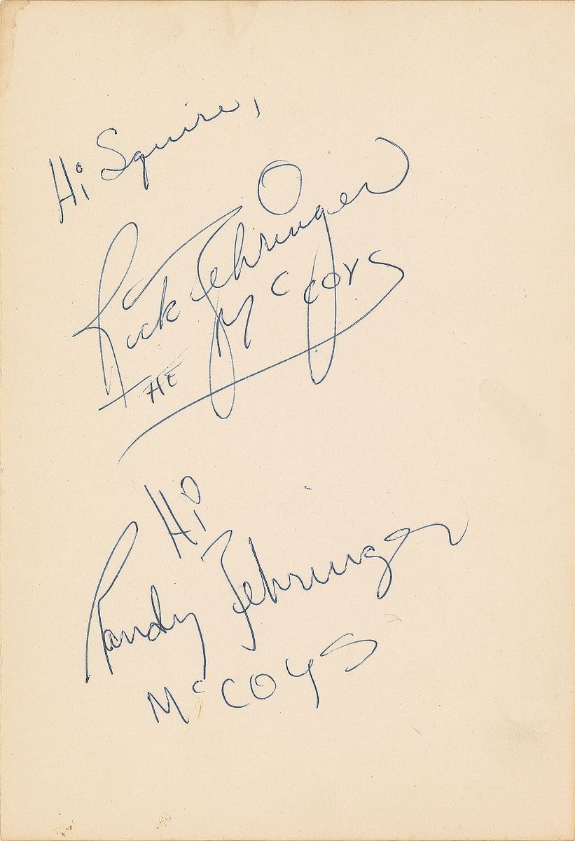 Ballpoint signatures, “Hi Squire, Rick Zehringer, The McCoys” and “Hi, Randy Zehringer, McCoys,” on an off-white 5 x 7.25 cardstock sheet. Signed on the reverse in ballpoint by singer Fran Warren. In fine condition.