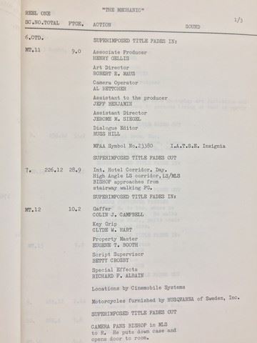 "The Mechanic" (1972) from United Artists, original release script. Charles Bronson as Arthur Bishop is a veteran hit man who, owing to his penchant for making his targets deaths seem like accidents, he thinks of himself as an artist. It's made him very rich, but as he hits middle age he's so depressed and lonely that he takes on one of his victim's son's. Steve McKenna as Jan-Michael Vincent is his apprentice. Arthur puts him through a rigorous training period and brings him on several hits. Arthur worries as Steven improves he'll discover who killed his father. (Approx. 13"x8").