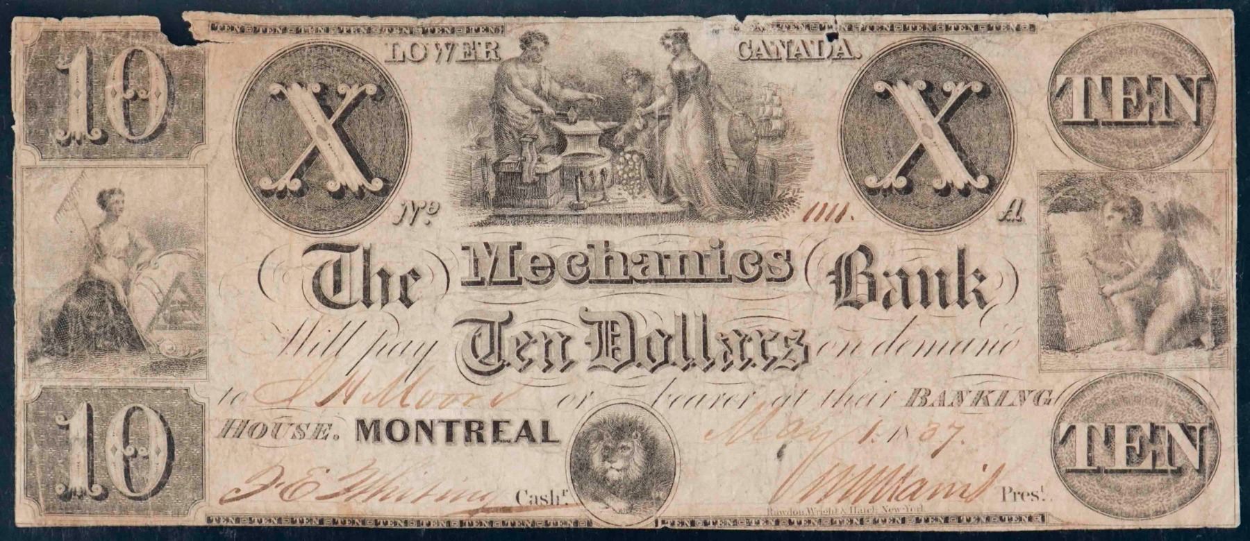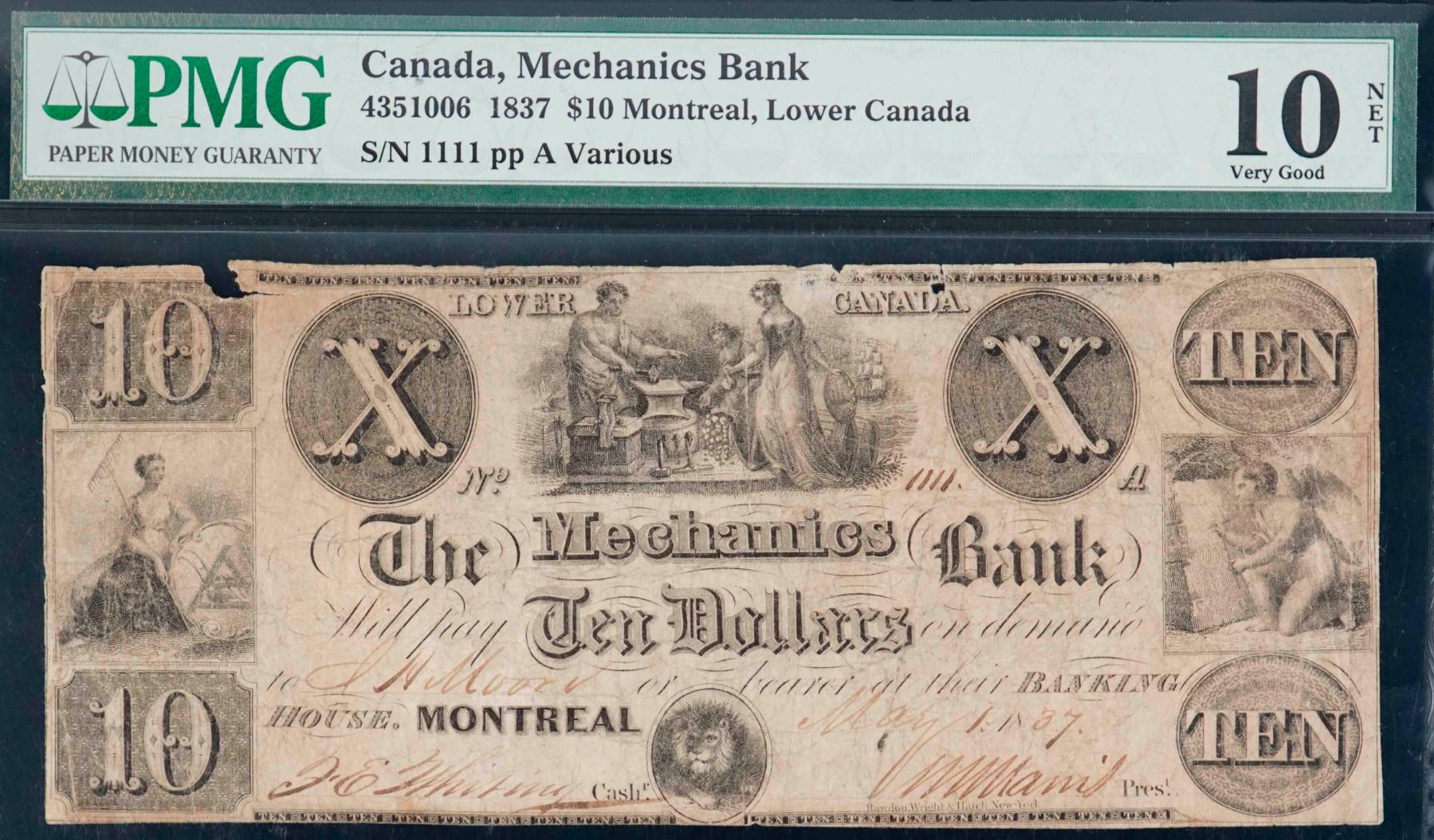 The Mechanics Bank; 1837 $10 #1111 CH-435-10-06, PMG Very Good-10 Net w/missing pieces. RARE SOLID NUMBERED (BINARY) ISSUE.