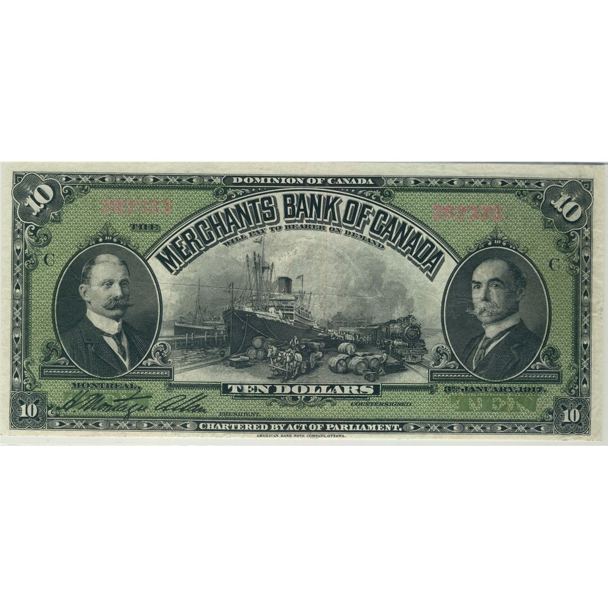 The Merchants Bank 1917 $10 #202333 CH-460-20-06 PMG VF25, excessively scarce. Tied for finest known.