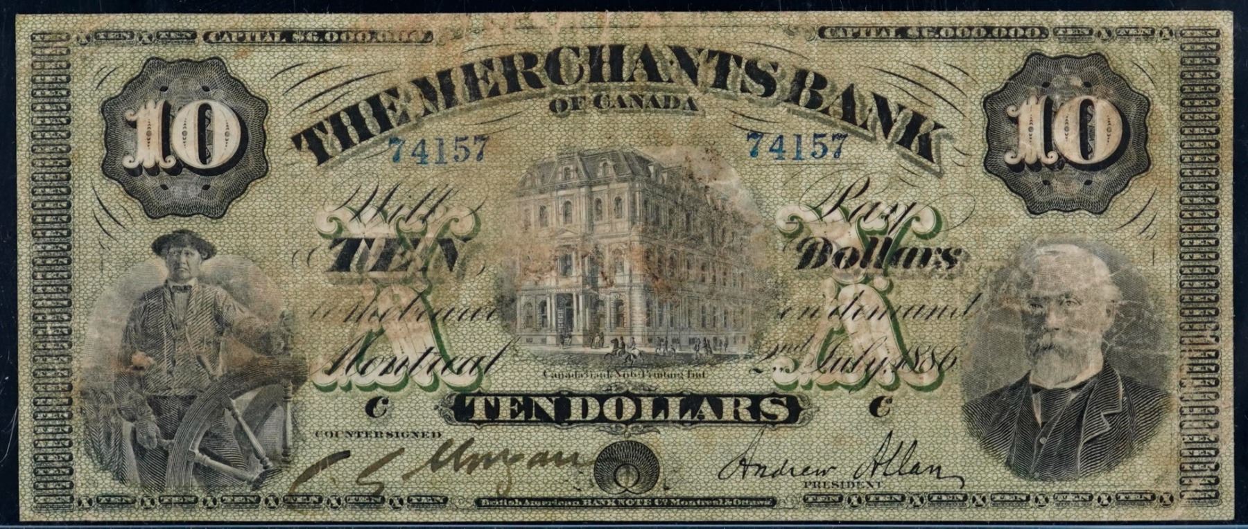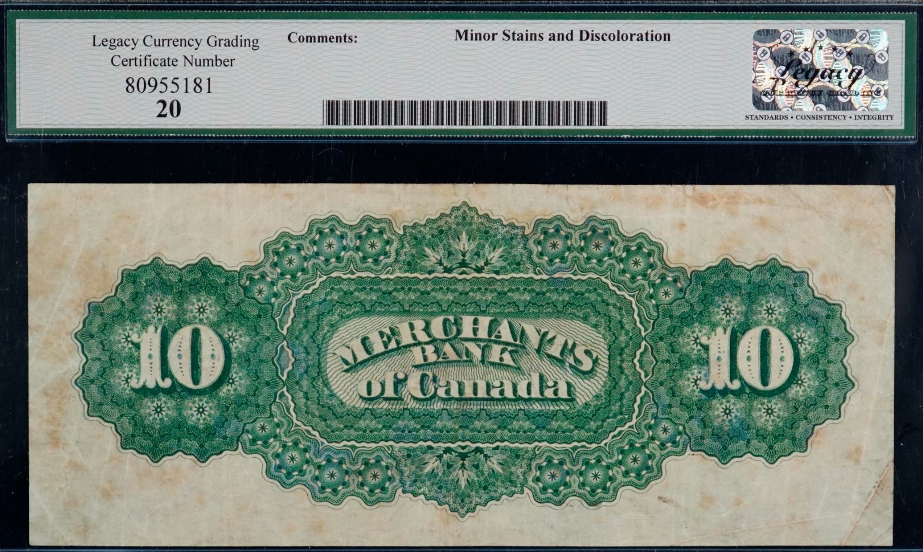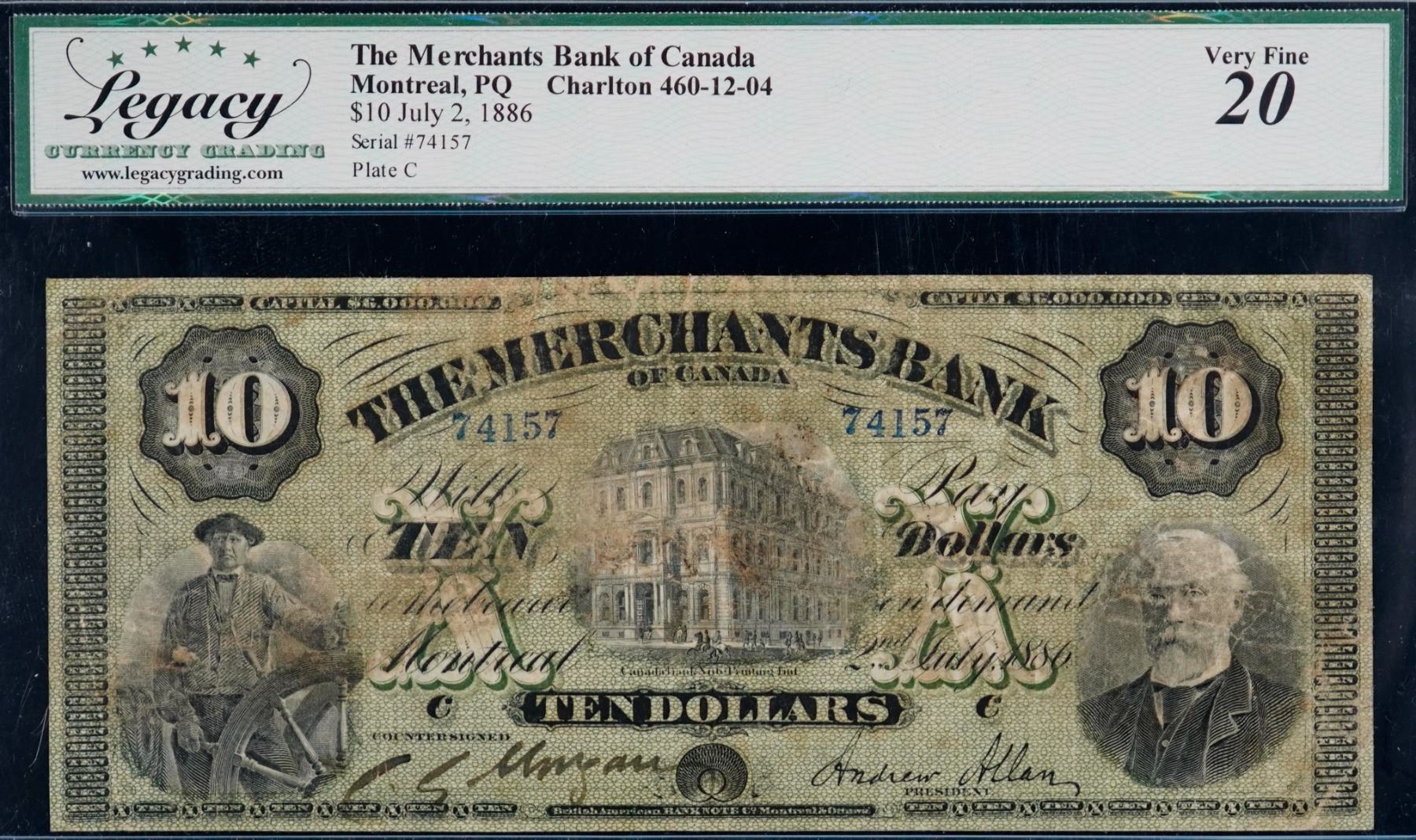 The Merchants Bank of Canada 1886 $10 74157 CH-460-12-04 Legacy Currency Grading Very Fine-20 with minor stains. Very scarce and seldom offered.