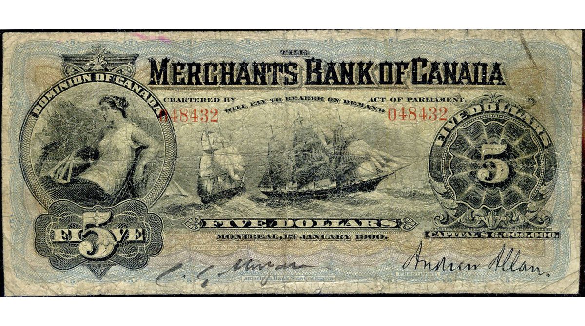 The Merchants Bank of Canada; 1900 $5 #048432 CH-460-14-02 PMG VG10. Only two examples known. Excessively rare.