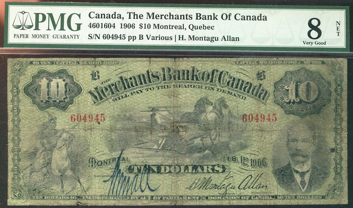 The Merchants Bank of Canada 1906 $10 #604945 CH-460-16-04 PMG VG8, affordable example. Minor repairs.