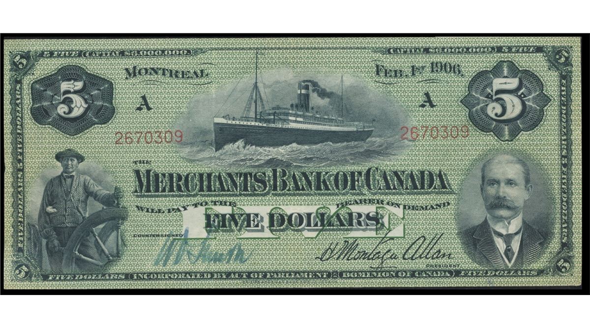 The Merchants Bank of Canada 1906 $5 #2670309, CH-460-16-02, CCCS EF40. A lovely bright and clean example.