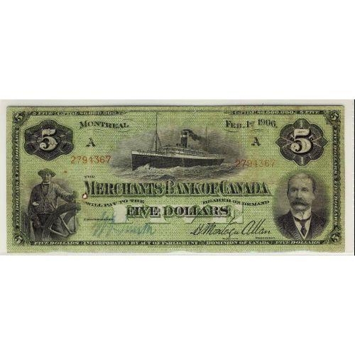 The Merchants Bank of Canada 1906 $5 CH-460-16-02 No.2794367 F+ with a small hole but not too distracting.