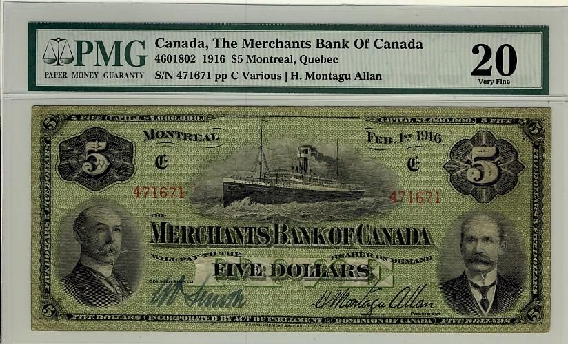 The Merchants Bank of Canada, 1916 $5 #471671, CH-460-18-02, PMG VF20. Scarce grade.